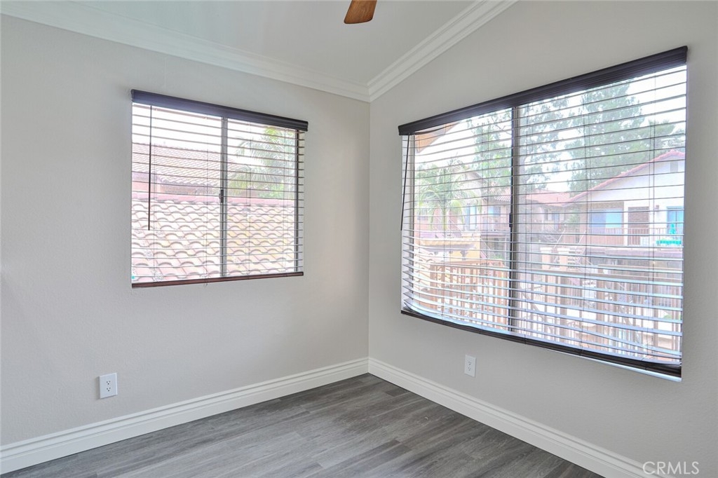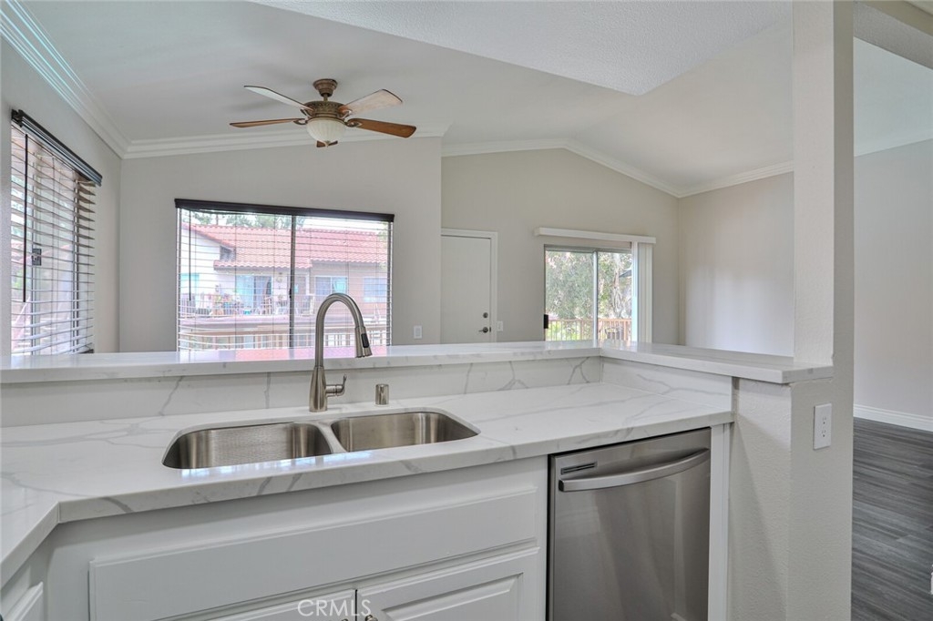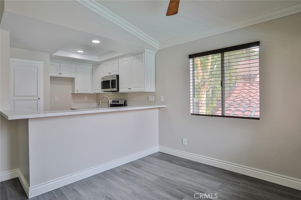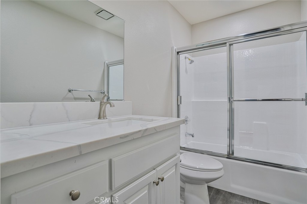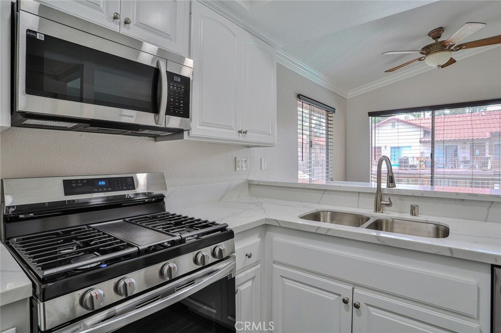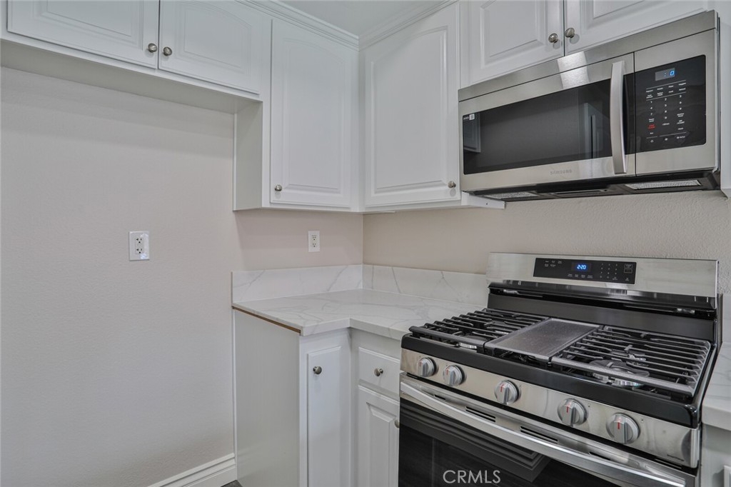 Welcome Home to this Stunning Remodel!!! As You enter this light and Airy Condo you step onto the New Decorative Grey Vinyl Flooring. You can't beat this Large living area which also has a good size Dining area. The Kitchen was totallly remodeled: Recessed lightning installed, New Stainless Microwave, New Stainless Steel Stove with 4 burners and a Griddle for maklng that perfect Bacon. New Stainless Steel Dishwasher, New Stainless Sink with New Faucet and New Garbage disposal and Upgraded Cabinets. All New Quartz with designer white and grey Counter tops in Kitchen and both baths. This Condo offers 2 large Bedrooms one of the rooms has its own ensuite bathroom. Every attention to detail including, Raised Panel doors, Mirrored bedroom closet, Large Crown Molding and Large base Molding. Bathrooms both have New Toliets. The Bedrooms have New Carpet as to be soft on your feet as you pop out of bed! Front and Rear Balconies, Sit and Enjoy the Sun with a Pool View or pop on down and take a swim or just hang out in the Spa. This Condo has All You have been looking for and is a End Unit with only 1 Neighbor! Just a few steps to Your Own Private 1 Car Garage that has been freshly painted. For those who need to Commute this is the perfect location as it is situated freeway close to the 91 and 15 Freeway! Make this Comfortable and Quiet Condo Yours Today!