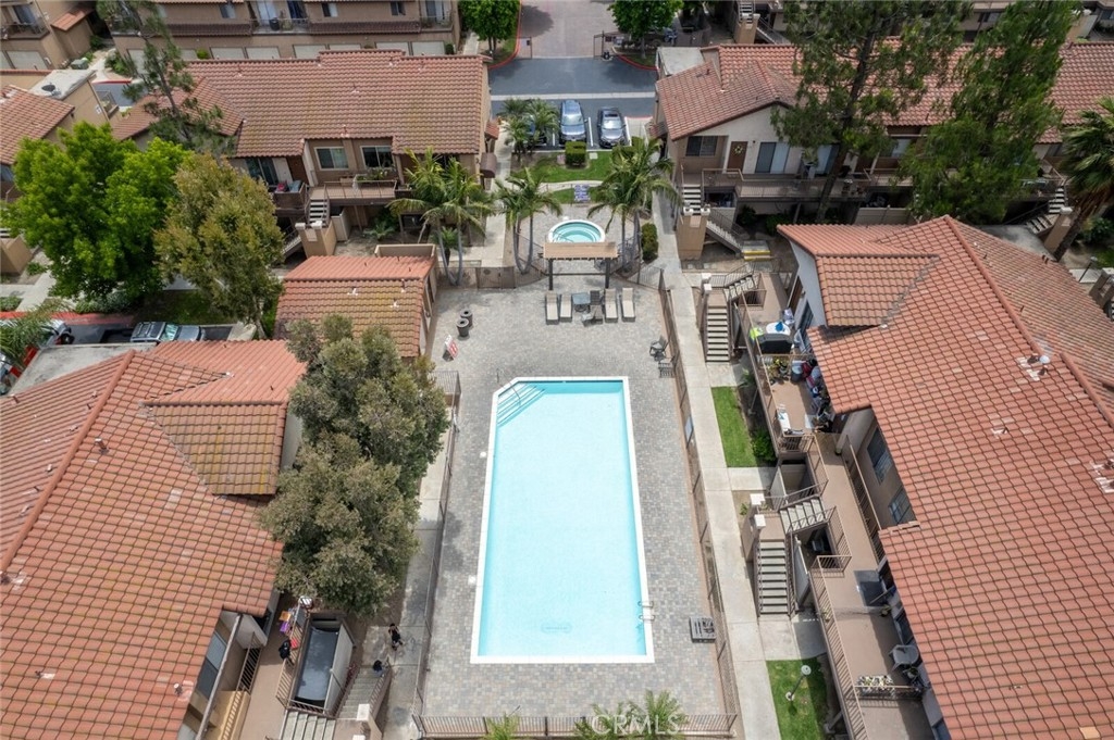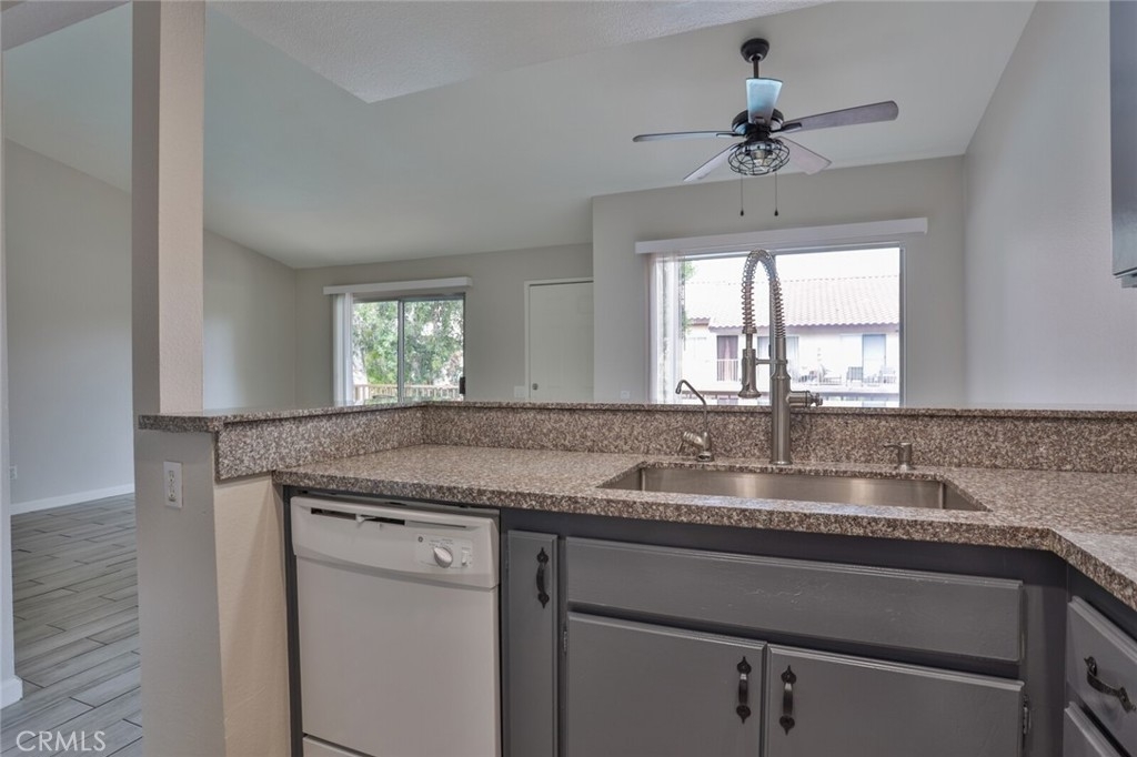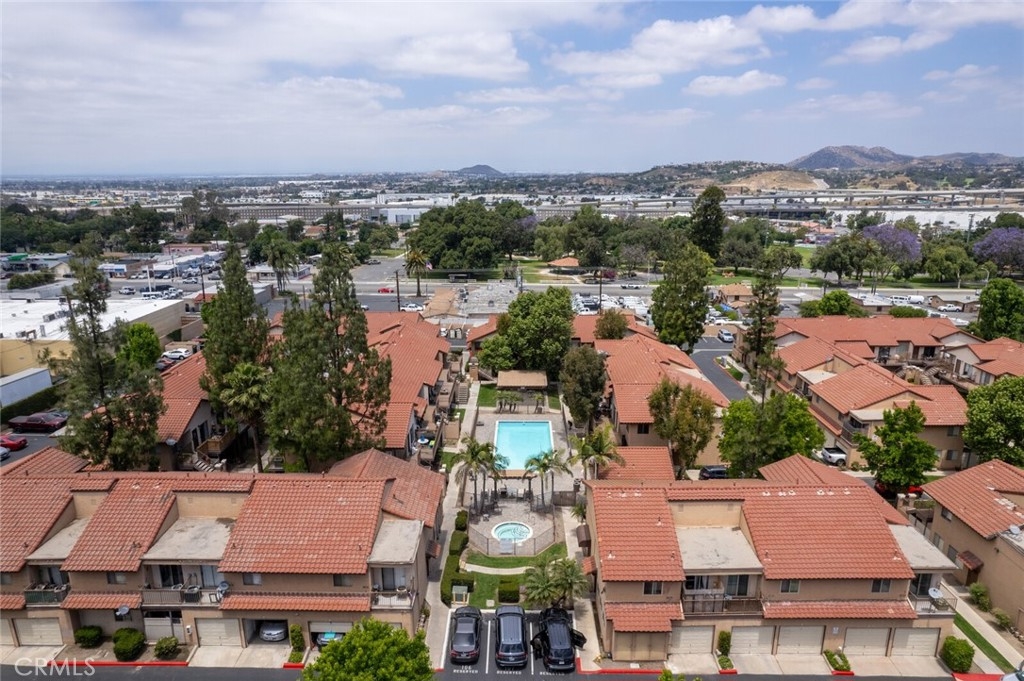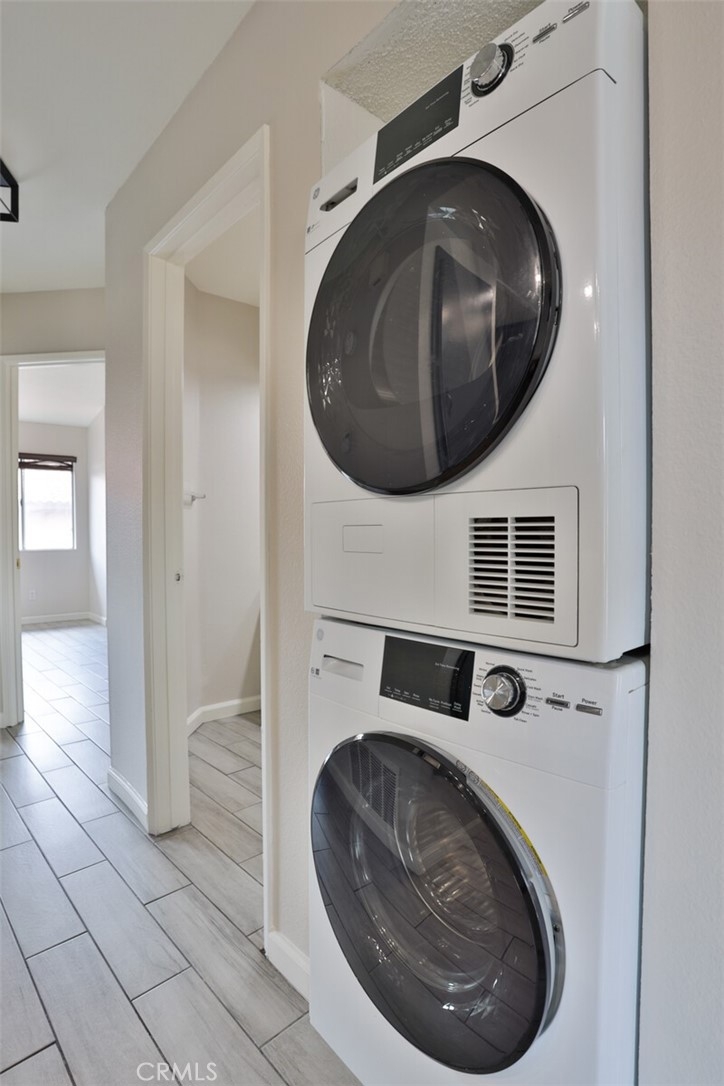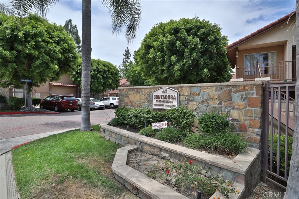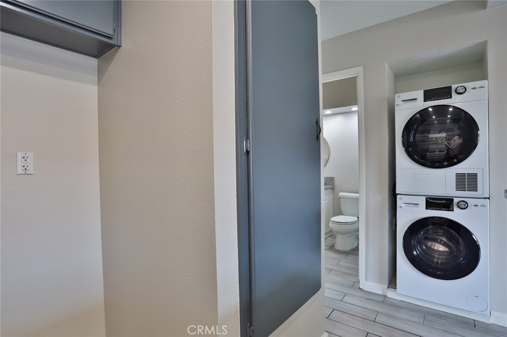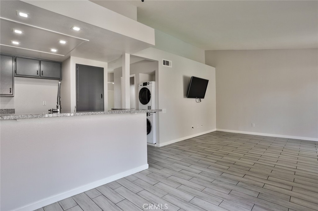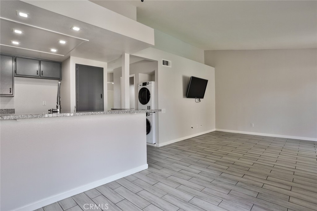 Welcome to Your New Home! This Unit has been freshly painted including the Grey kitchen cabinets. Upon entering this light, bright and Airy Home you will step onto the Designer Grey Vinyl wood like flooring. This Home opens to a large living room with an additional area for your Dining set. In the Living Area a Large Screen TV is being offered with this Stunning Home. One of the main features of this home is that it has it's own washer and dryer which also are being offered. The Beautiful and Freshly painted kitchen and cabinets also have Granite Counter Tops . The Guest bath also has granite counter tops as well as the Master Suite bath. Looking to relax well just sit outside on Your patio, grab a beverage and gaze out over the Sparkling Pool and Spa or pop down and take a swim or just hang out in the Spa! There is also a rear Patio off of the bedroom. The Private 1 car Garage has been freshly painted and is only steps away from your home and there is also a secondary parking spot assigned to this unit. For those who need to Communite this is the perfect location as it is situated freeway close to the 91 and 15 freeway! Make this Comfortable and Quiet Condo Yours Today!