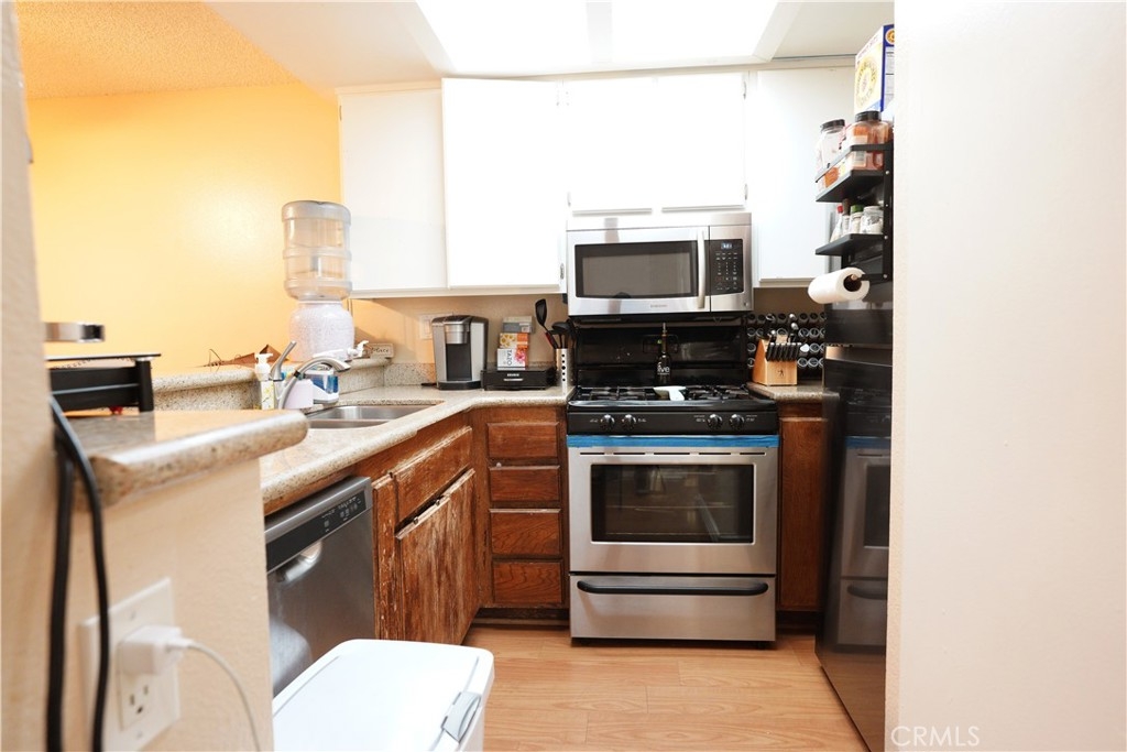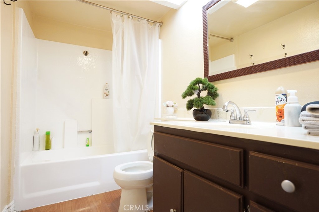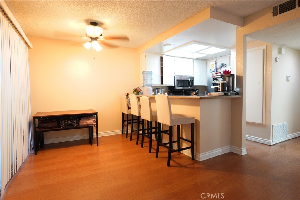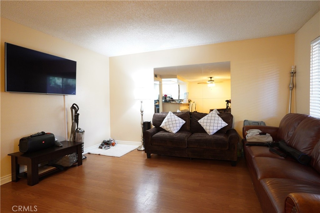 Welcome to this beautiful first floor 2beds and 2baths condominium. The open concept of the kitchen to the dinning and living room is perfect for entertain your guest without missing anything. The master bedroom has a full bathroom with a shower over the tub. The second bedroom is next to the master bedroom. The house floor is laminate except the 2 bedrooms that have carpet. Walk outside your patio to relax or simple to drink a cup of coffee. There is a one car garage and one assigned car space. During the hot days, enjoy the swimming pool, jacuzzi and the BBQ. There are 2 laundry facilities in the complex and best of all it's a gated community. Centrally locate near the schools, park and freeways.