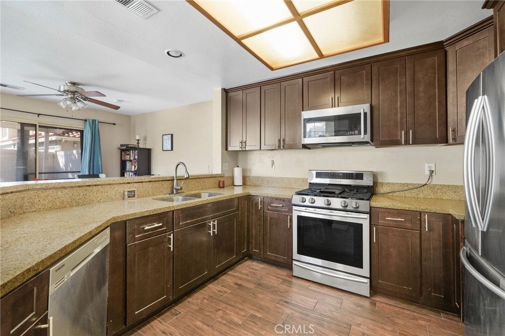 Introducing this charming corner unit condo nestled in the vibrant city of Corona. Boasting two bedrooms and 2 1/2 bathrooms, this home features an open floor plan that seamlessly connects the kitchen to the family room, creating an ideal space for both daily living and entertaining. The master bedroom is a retreat of its own, offering a separate bathroom area with dual sinks for added convenience and a spacious walk-in closet to meet all your storage needs. Located within a highly desirable community, this condo comes with the added perks of a refreshing pool and a clubhouse for residents to enjoy. Your attached two-car garage ensures the utmost convenience in your day-to-day life. Situated just minutes away from a plethora of popular dining and shopping options, this property offers the perfect blend of comfort, convenience, and community living. Don't miss the chance to call this Corona condo your new home!