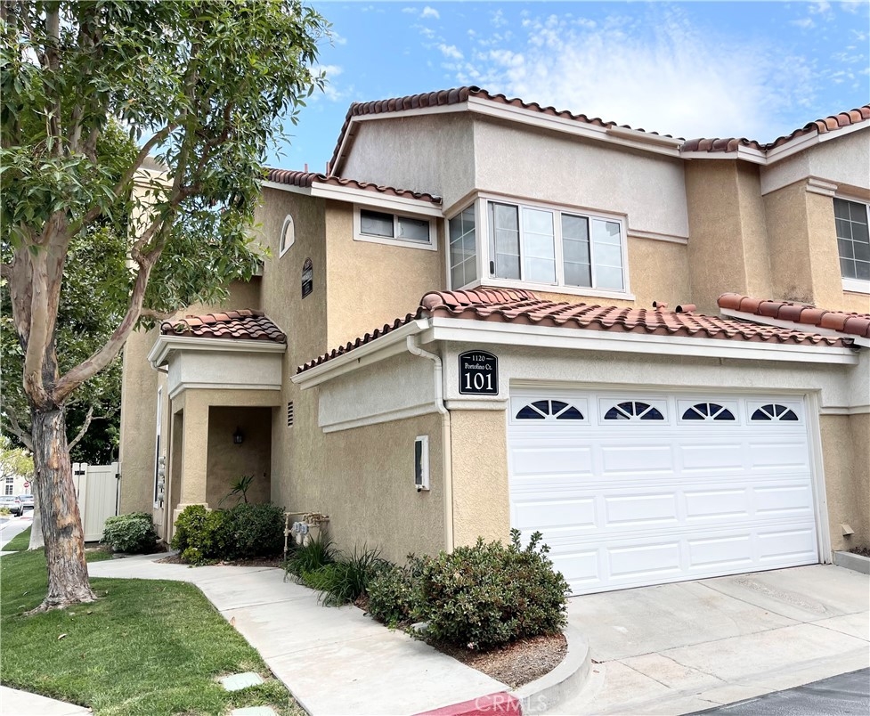 Welcome to this Beautiful Condo on a corner lot. Located in the highly desired Cortina community. This home features open floor plan including vaulted ceilings, Updated kitchen with granite countertops. half bath downstairs and a warm fireplace. Upstairs you'll be pleased to find the master bedroom with updated bath. and second bedroom with bath in hallway. Attached 2 car garage for your convenience. Open your French doors from living room to find gorgeous and spacious entertaining area with palm trees, perfect for BBQ's with Family and friends. Also get ready to enjoy all the amenities this community has to offer, Pool/ Spa, Club House. Located near Freeways, schools and shopping centers. DEFINITELY A MUST SEE!