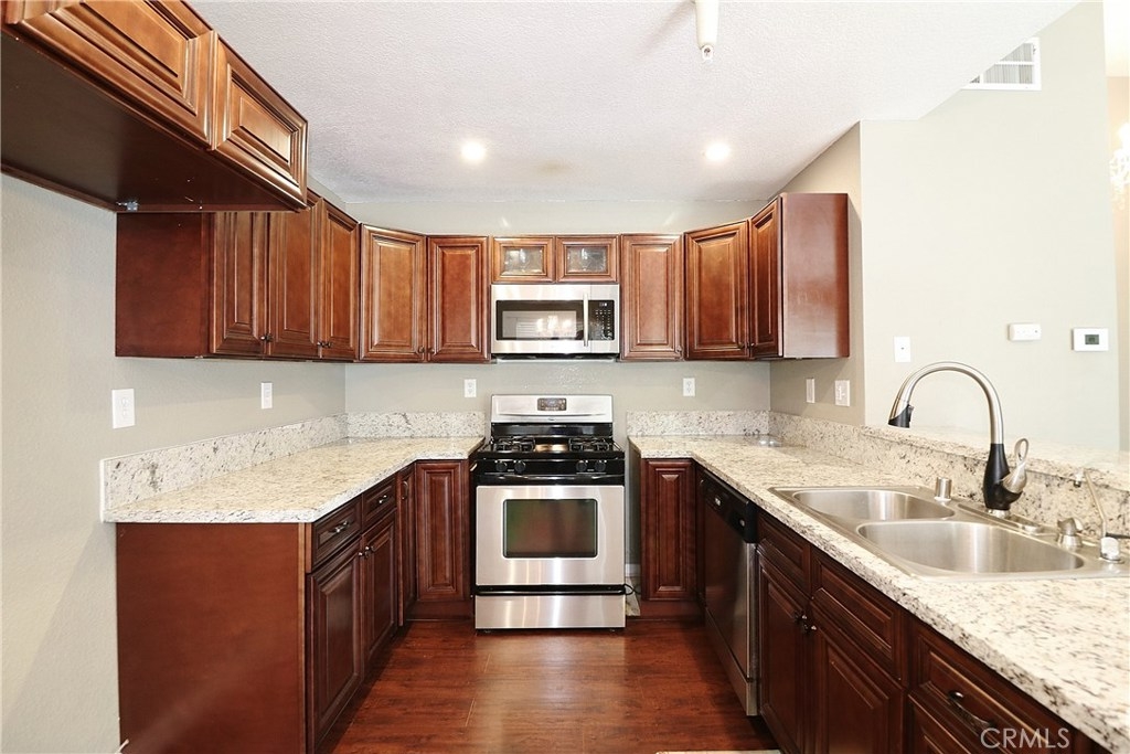 Welcome to "Crown Villa" ,Gated Community in the West part of Corona with easy access to Foothill Parkway and 91 Freeway. This is one of the Best View Units in the Community!!! Upper Unit, 956 Sq/Ft, Built in 1991, 2 Bedroom, 2 Baths, (Each Bedroom has its own Bath) View Deck off Living Room , Engineered Wood Floors, Remodeled Kitchen, New Cabinets w/ Soft Close, Glass Inserts & 2 Lazy Susan's, Granite Counters, Stainless Steel Appliances & Sink, Dishwasher, Breakfast Bar & Nook, Upgraded Baseboards, LED Recessed Lighting, Chandeliers, Stackable Washer/Dryer, Spacious Bedroom, Clean Unit Ready for Move In!! The Association Offers some of the Finest Amenities around including Pool, Spa, Picnic Area, Newly Resurfaced Tennis Court & Basketball Court, Gym/Exercise Room, Club House, Dog Park and Volleyball Court and if you like hiking, minutes to Skyline Trail!! Water, Trash, Exterior Insurance is Included in HOA Fee, Low Taxes Too! *** FHA APPROVED COMMUNITY****