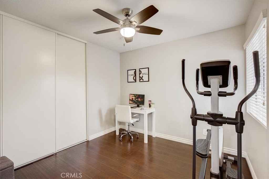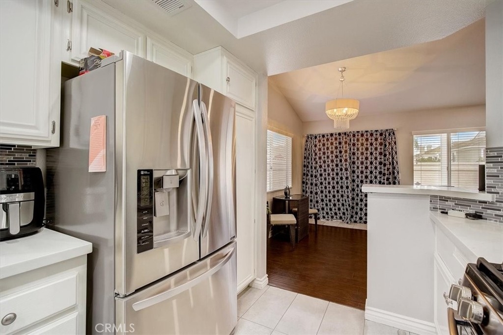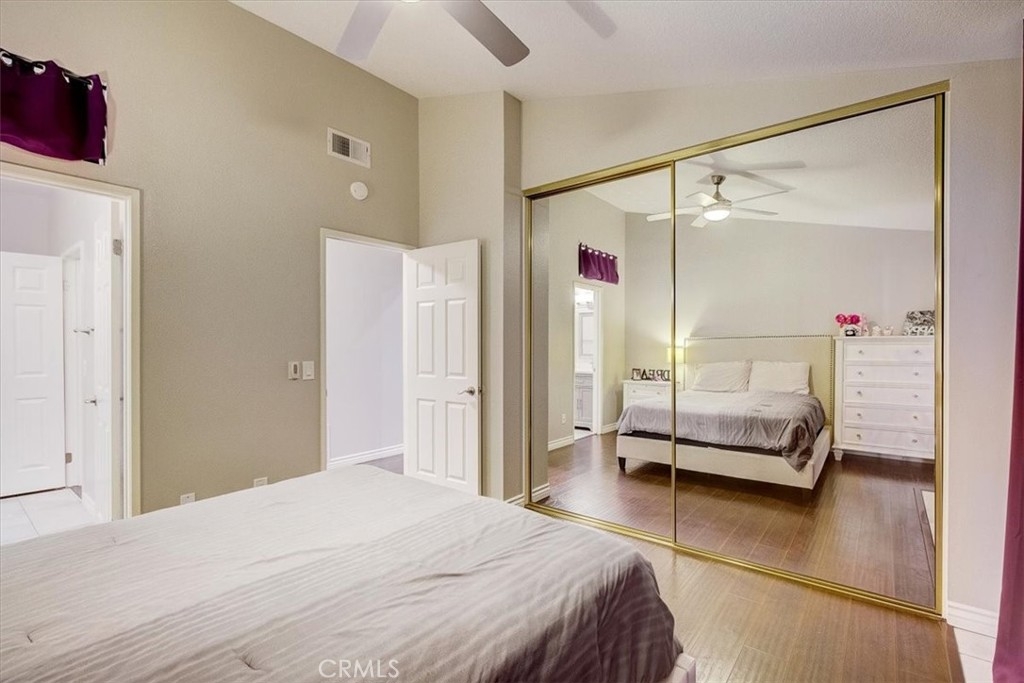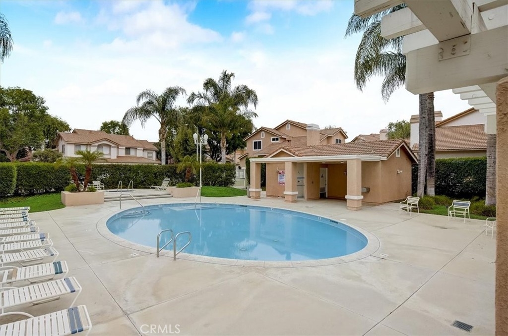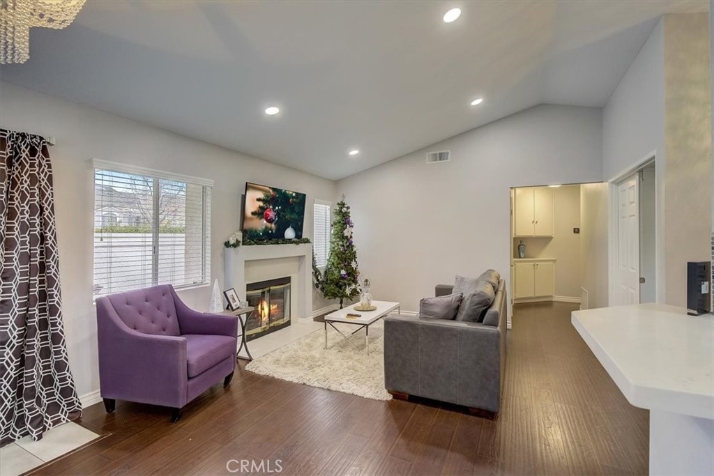 Move-in ready 2 bed, 1 bath home with an attached 2-car garage, and located on a corner lot! This home offers a spacious floorplan with vaulted ceilings, recessed lighting, and beautiful laminate-wood flooring throughout the main living areas. The living room has a fireplace and opens to a dining area. The kitchen has white cabinetry, quartz countertops, tile backsplash, and stainless steel appliances. Both of the bedrooms are generously sized, and the primary suite has a private slider to the backyard and accesses the hall bathroom with dual sink vanity also with a quartz countertop. Enjoy the private backyard with 2 patios each with built-in fans, the perfect space for relaxing & entertaining guests! Residents of this community also get to enjoy a swimming pool and spa! This home is conveniently located near schools, shopping, dining, parks, the 91 Fwy, and the 15 Fwy!