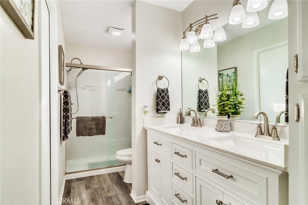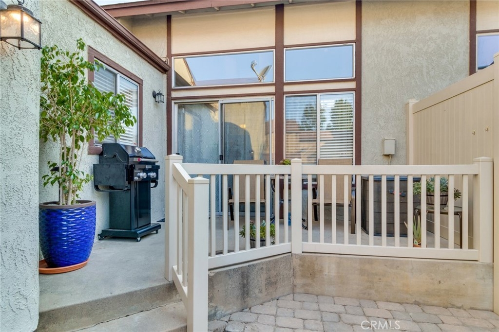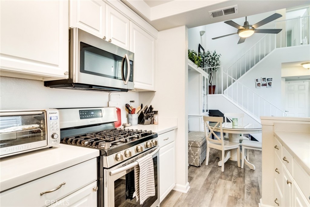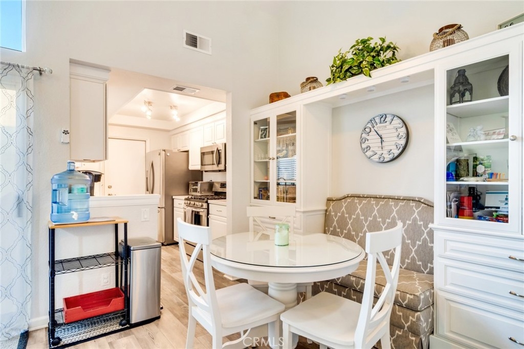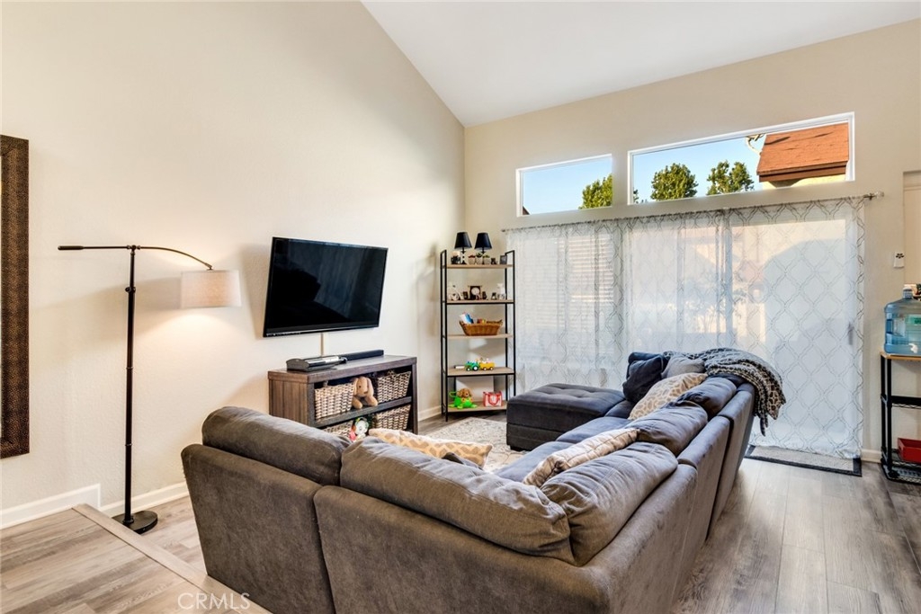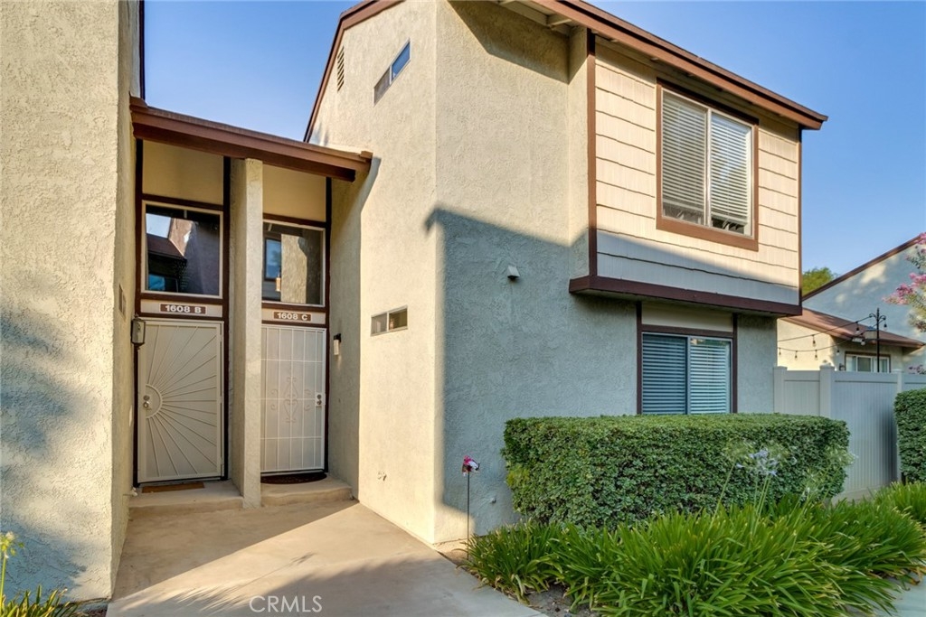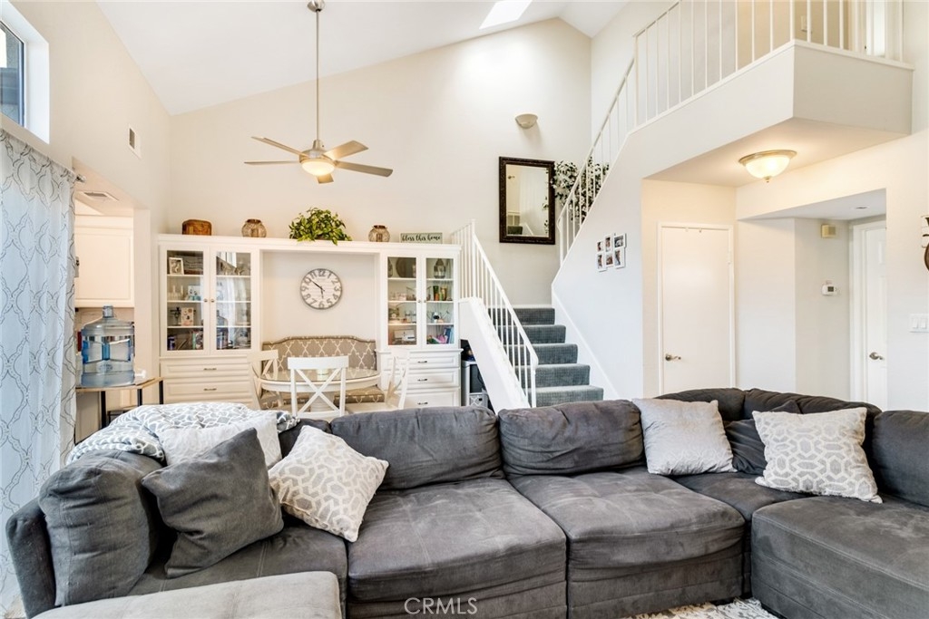 Be prepared to have your socks blown off! This property is totally turnkey and ready for you to just move in. The owners have taken great care to make this property a beautiful home from the designer paint to the many upgrades they have done to the property since they purchased in 2018. You will first notice the updated lighting by the front door. As you enter, you will feel the vaulted ceiling, walk into the living room and feel how open the space is. The flooring was updated to a beautiful grey laminate and the whole property was painted in the interior. Elegant lighting and a ceiling fan accentuate this light and airy living and dining areas. In the kitchen you will notice all of the upgraded stainless appliances, galley style kitchen with a window over the kitchen sink and light colored quartz countertops. At the end of the kitchen is the access to the one car garage where the washer and dryer and hot water heater are housed. On the other side of the kitchen is a dining area and a beautiful custom built in bench with glass bookcases and storage on each end. Downstairs there is also one bedroom with upgraded grey carpet, and a completely remodeled bathroom with furniture style cabinetry and a walk in shower with privacy glass.  This unit probably has the nicest upgrades in this community. Upstairs you will find upgraded carpet and a secondary bedroom with custom window treatments and another fully remodeled bathroom down to the pipes. Outside the slider is a cute patio with room to bbq and lounge protected by a vinyl fence. The garage has room for one car and some shelving on the walls.  This complex is a great location as you are close to Stater brothers market, and Starbucks on Magnolia. Super close to access the 15 freeway and HOA amenities include pool, spa and bbq area. You have to see to appreciate how clean it is!
