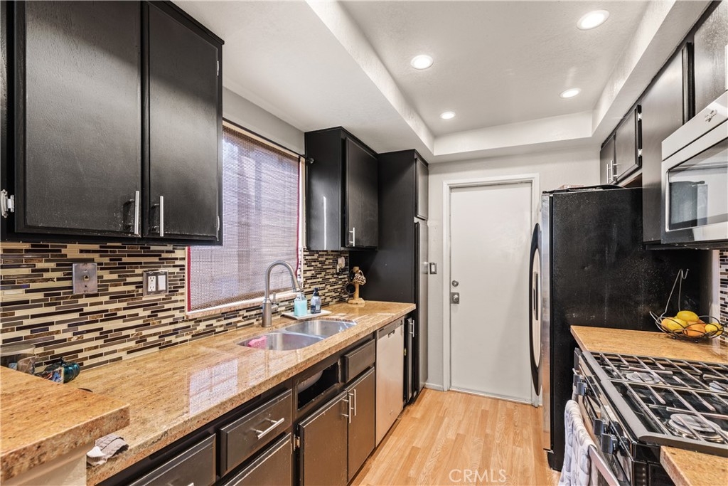 This beautiful 2 bedroom 2 bath Townhouse is centrally located within the Laurelwood community of Corona. It offers many unique features including a dual master layout (1 upstairs, 1 down), loft, vaulted ceilings, private patio & yard, attached garage & new central heating & air conditioning. Once inside the light & bright sun drenched interior feels much larger due to the vaulted ceilings and large windows / slider off the Living Room. The downstairs flooring was updated to a neutral tan wood laminate that runs throughout the Living Room, Dining Room & Kitchen. In the gourmet kitchen you will find espresso colored cabinetry, granite countertops & stainless steel appliances. Off the kitchen is access to your attached 1 car garage w/ laundry area (1 additional assigned parking space next to it). Off the Living Room is a slider w/ plantation shutters that leads to your private backyard complete w/ patio area & synthetic grass. Rounding off the tour of downstairs is a master suite w/ access to an oversized bathroom complete w/ walk in shower. Upstairs you will find a small loft that could be used as a small lounge / TV area or for a home office setup / kids playroom. Along with the other master bedroom complete w/ an en-suite bath. Community amenities include a pool, spa & BBQ area. This complex is a great location w/ super close access to the 15 & 91 freeways, along with being across the street from Stater Brothers, Starbucks & more. Low HOA dues, Low Taxes, and your own starter home for a FANTASTIC PRICE! Run don't walk to this one, as it will be gone in the blink of an eye.