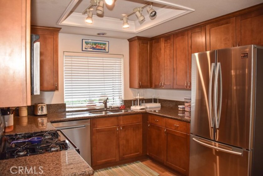 This beautiful Laurelwood condo features a remodeled kitchen with granite counters and an adjacent dining area, an open floor plan with vaulted ceilings, a sliding glass door that opens to a private patio, and a downstairs powder room. Each spacious upstairs bedroom features its own bathroom, with one bedroom also having a walk in closet. Pride of ownership prevails in this efficient floor plan which also features direct access to its single car garage! The Laurelwood complex features winding paths along well maintained open space and is convenient to the 15 and 91 freeways for commuters, as well as to restaurants, shopping, etc.
