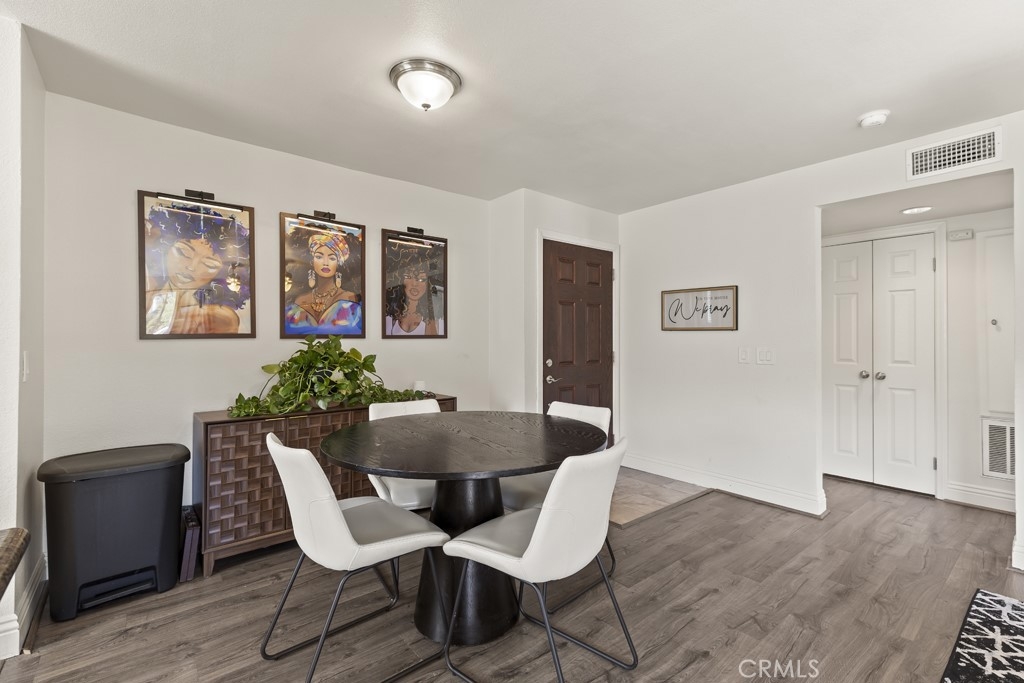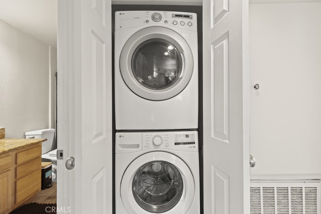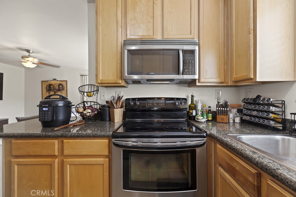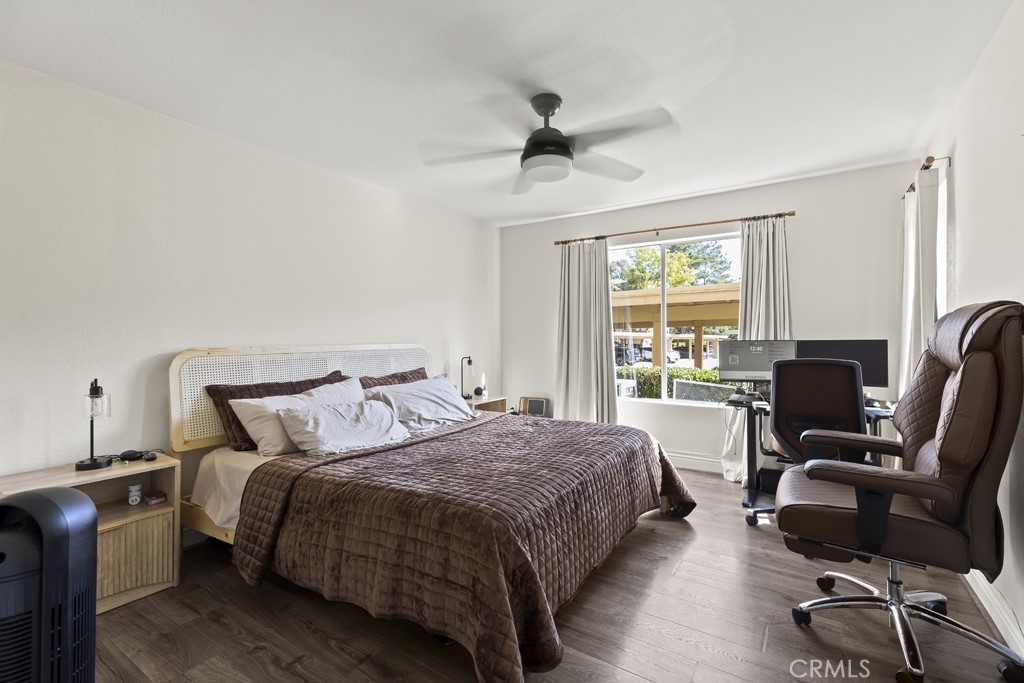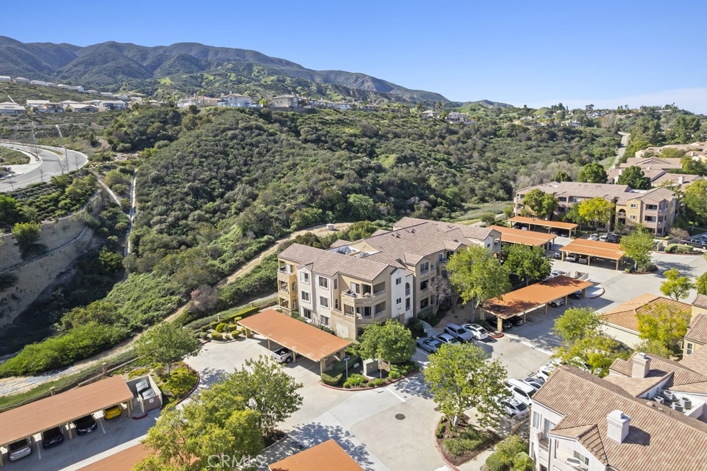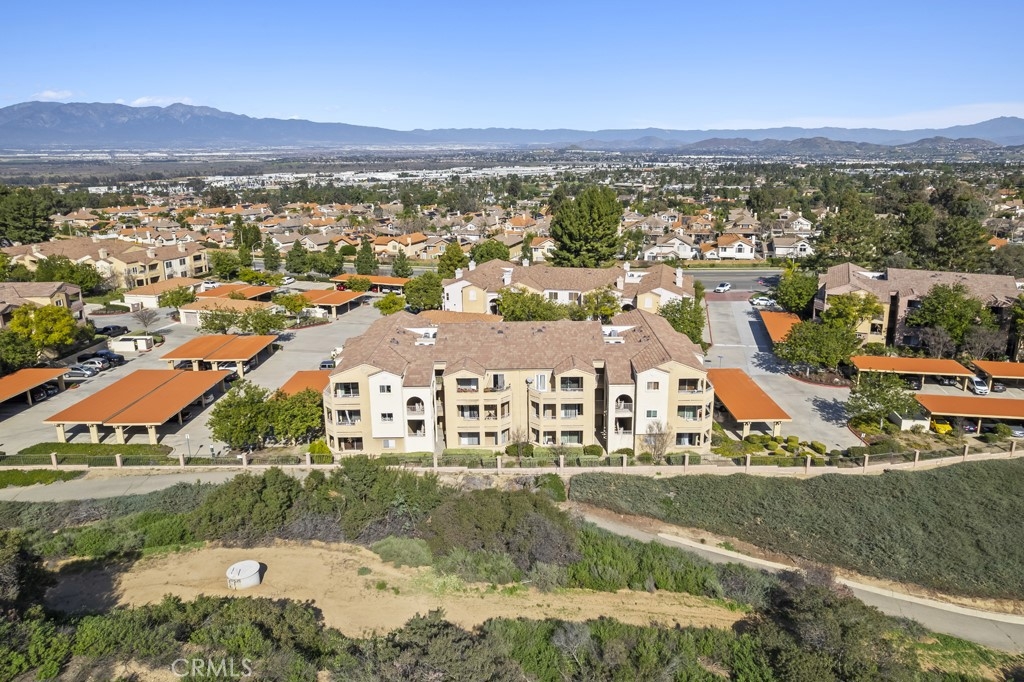 Well-maintained 1 bedroom, 1 bathroom condominium offering 735 sq ft of comfortable living in the desirable Sage Canyon community of Corona. This light-filled first-floor unit features an open-concept layout with a kitchen complete with granite countertops, electric stove, and seamless flow into the dining area and living room with ceiling fan. A laundry closet with space for a stackable washer and dryer adds everyday convenience. Step outside to a private patio with peaceful south-facing views of the surrounding mountains and canyons, plus a convenient storage closet. The spacious bedroom easily accommodates a large bed and includes a walk-in closet. The bathroom offers granite countertops and tile flooring. The unit includes one covered carport space and one additional assigned uncovered parking space. Sage Canyon residents enjoy access to a clubhouse, fitness center, swimming pool, and spa. HOA dues include hot water and trash. A great opportunity to own a move-in ready condo in a well-amenitized community.