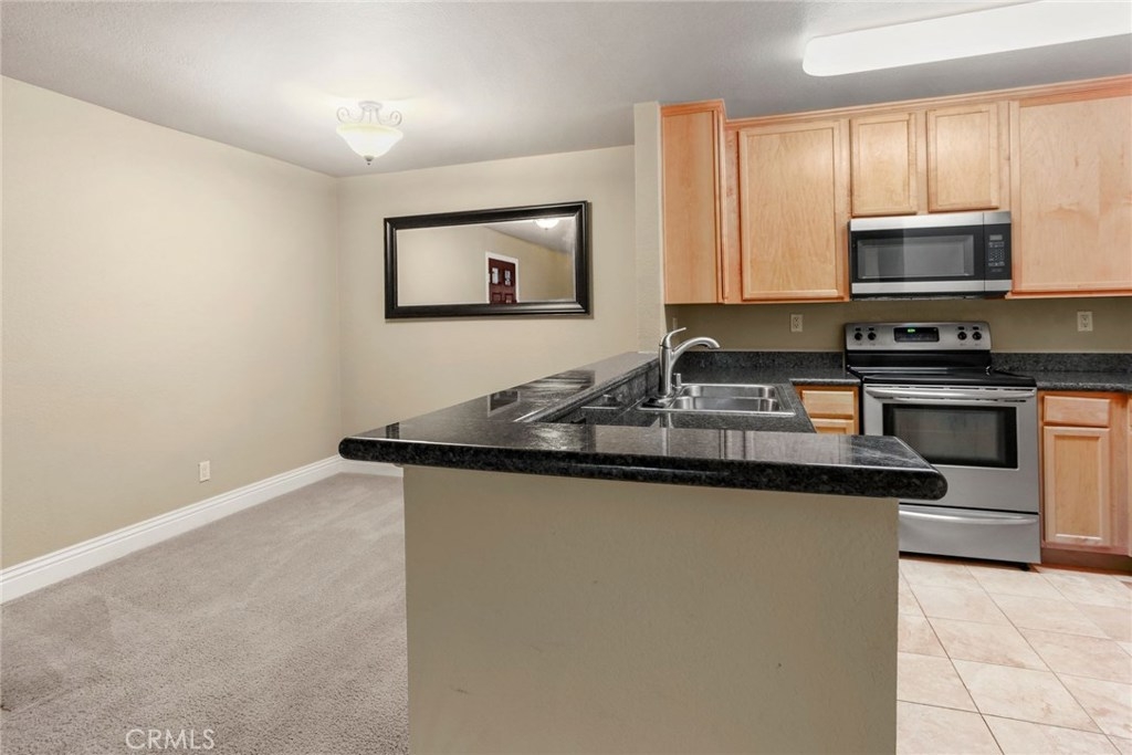 Beautiful 2 bedroom, 2 full bathroom single level condo in the community of Sage Canyon in Corona! Enjoy a spacious floor plan with newer carpet, a breakfast nook, recessed lighting, and a private outdoor balcony. The kitchen opens to the main living area and offers a breakfast bar, light wood cabinetry, tile flooring, and stainless steel appliances. The primary bedroom features a walk-in closet and a shower-in-tub in the primary bathroom. Additional property highlights include the inside laundry closet, 1 carport parking space, and 1 additional assigned parking space. Community features include the sand volleyball court, basketball court, swimming pool, spa, and clubhouse. Convenient to area shops, markets, and easy access to major freeways!