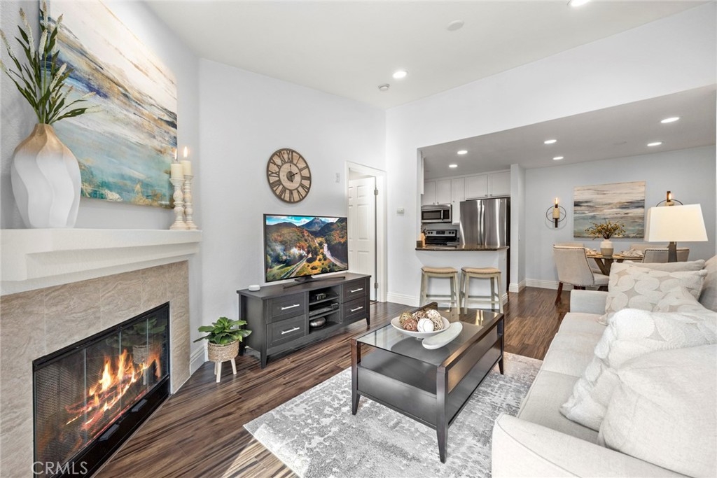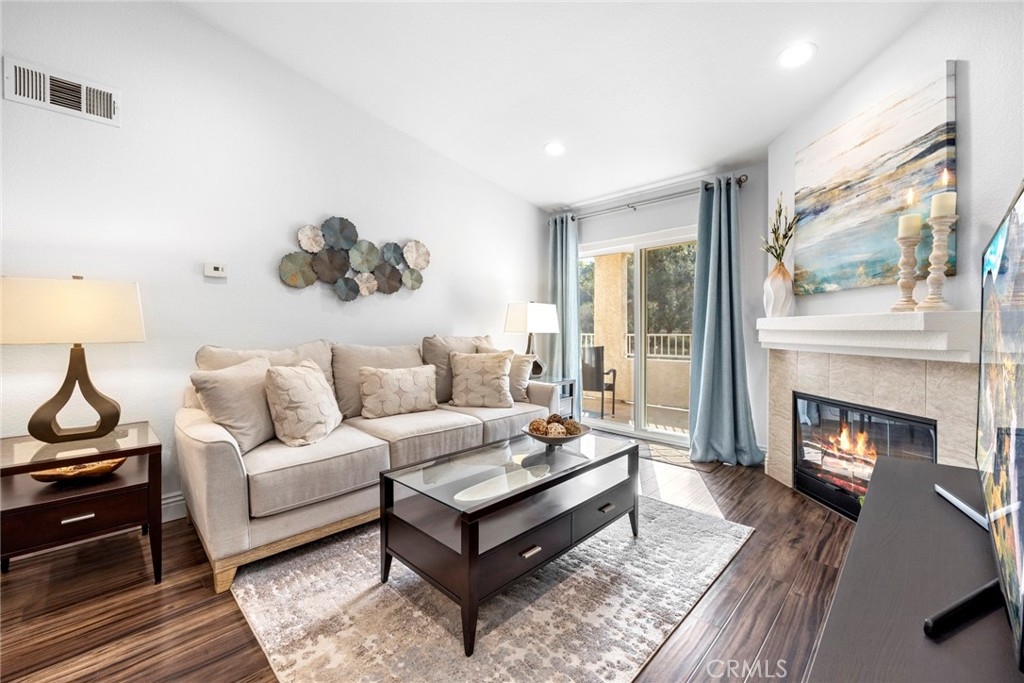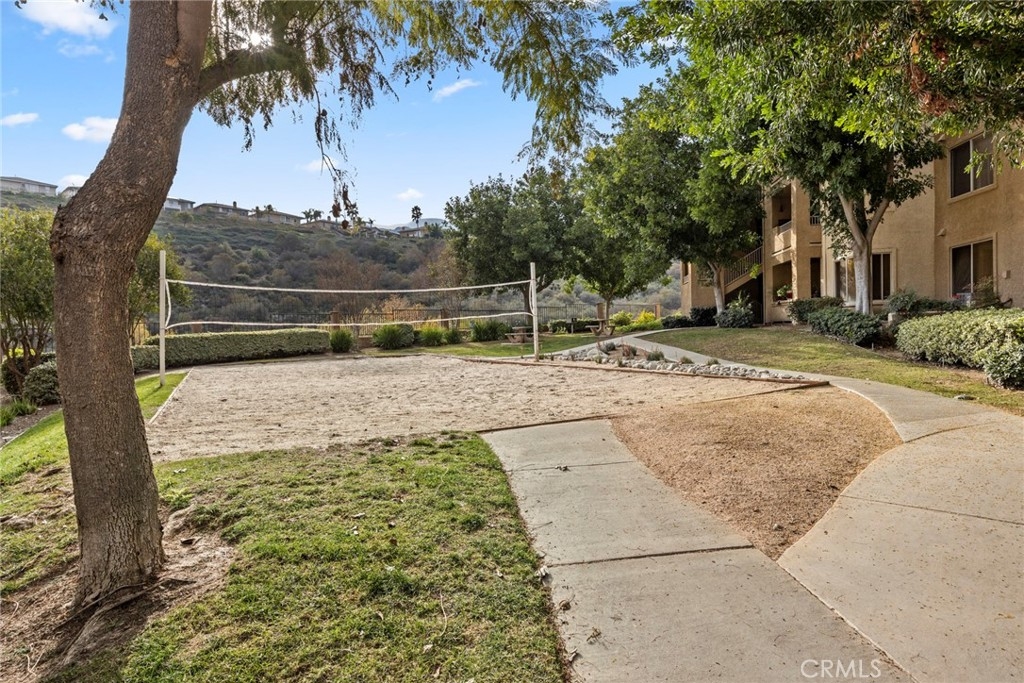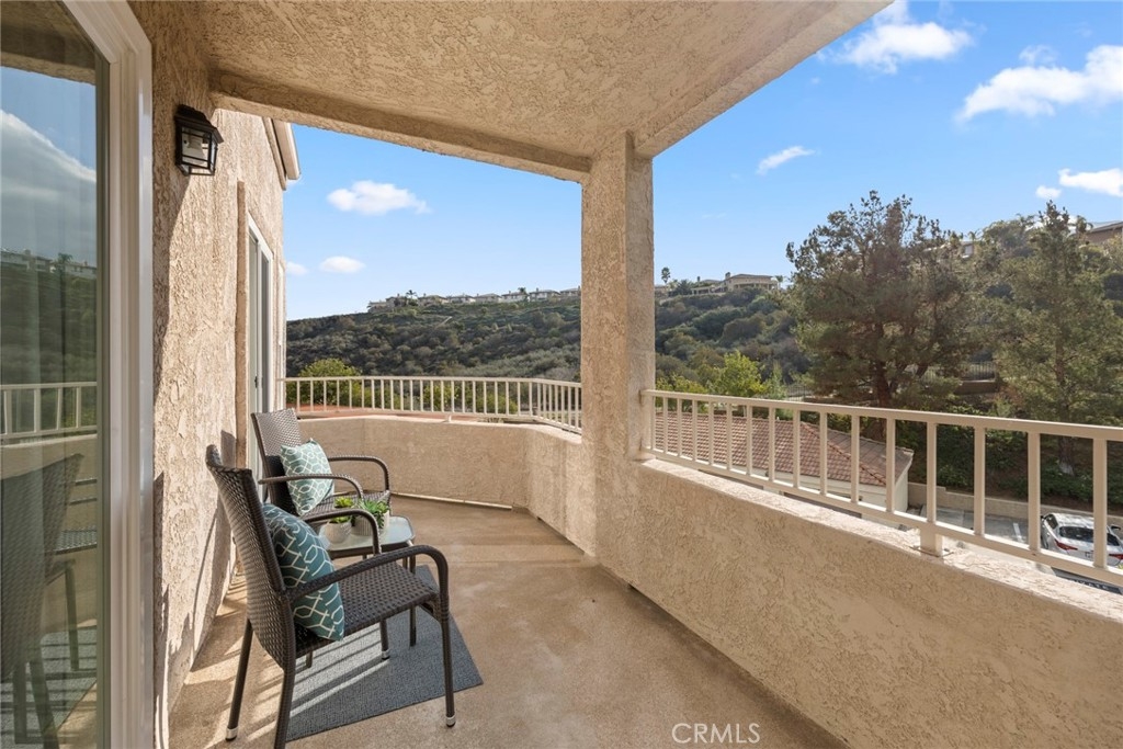Nestled in the foothills of the Cleveland National Forest, this gorgeous top level end unit condo has it all! Premier location in the rear of the complex gives you that coveted unobstructed view of the foothills from nearly every room as well as from your extra-large partially covered balcony accessed from both the living room and secondary bedroom. Open concept floor plan with vaulted ceilings is drenched in all day natural light from the abundant windows and features two bedrooms on opposite ends of the home to provide exceptional privacy. Great room living offers a cozy fireplace, nice sized dining area and updated kitchen with bright white cabinets, granite counters, stainless appliances, breakfast bar and huge walk-in laundry/pantry. Beautiful laminate wood floors with upgraded baseboards, plantation shutters, new sliding doors and cool tone paint extend throughout the living areas and bedrooms, each with their own expansive walk-in closets. Bathrooms have also been upgraded with granite vanities and newer glass enclosed shower tub combos. Private parking includes one covered and one uncovered space and is conveniently located adjacent to the building, plus a large storage closet off the balcony. Sage Canyon provides an exceptional living experience for its residents and offers a clubhouse, large pool, spa, basketball and volleyball courts, and state-of-the-art gym. Easy access to local shopping and dining as well as just one exit off the 91 if you’re headed to the OC.