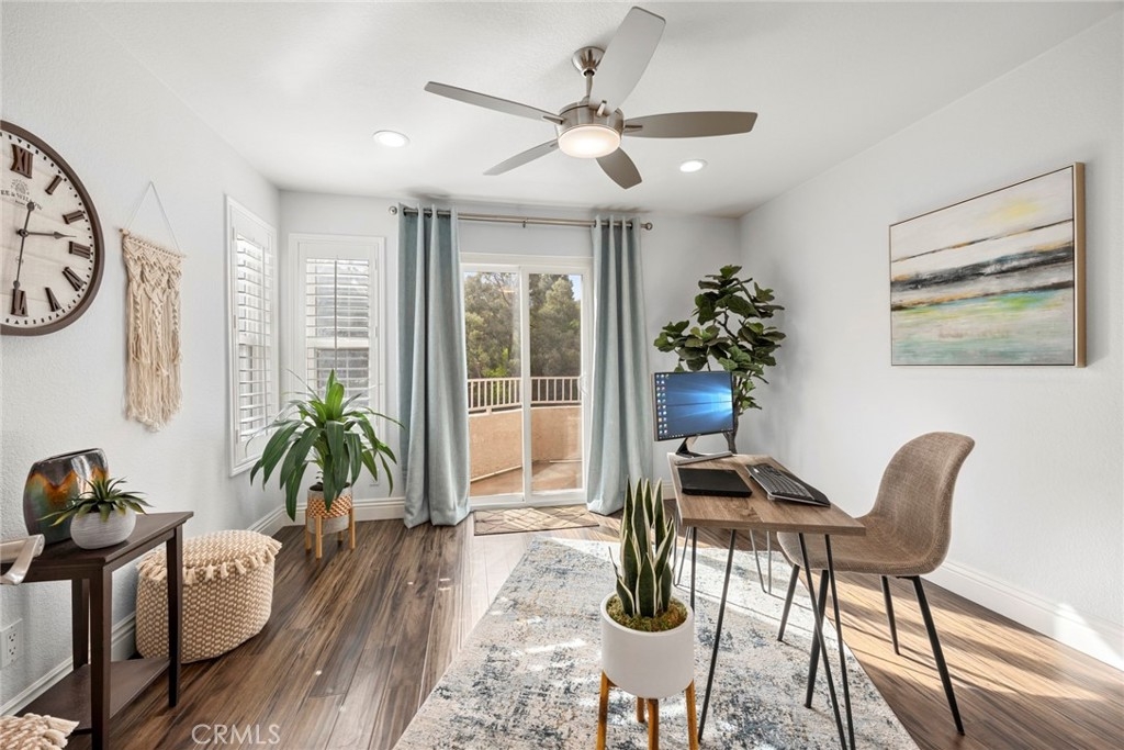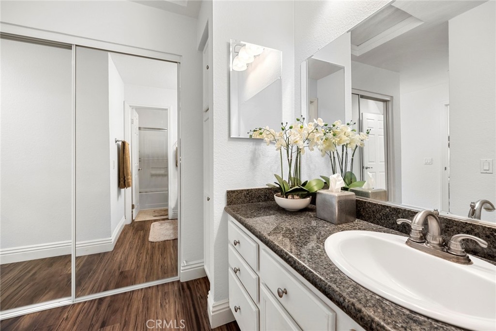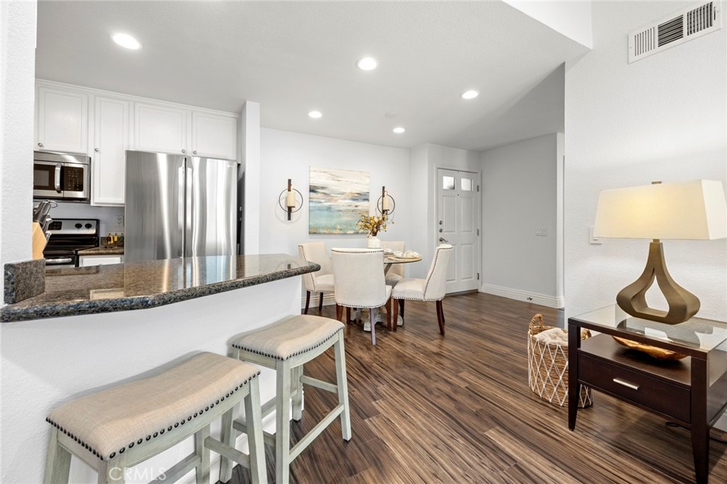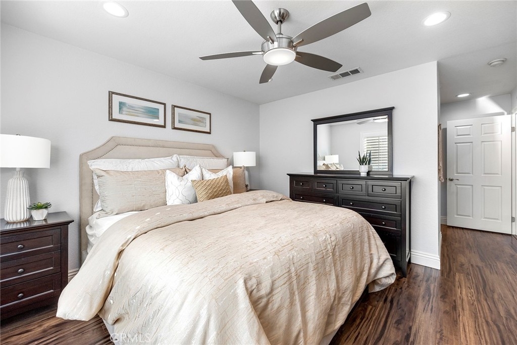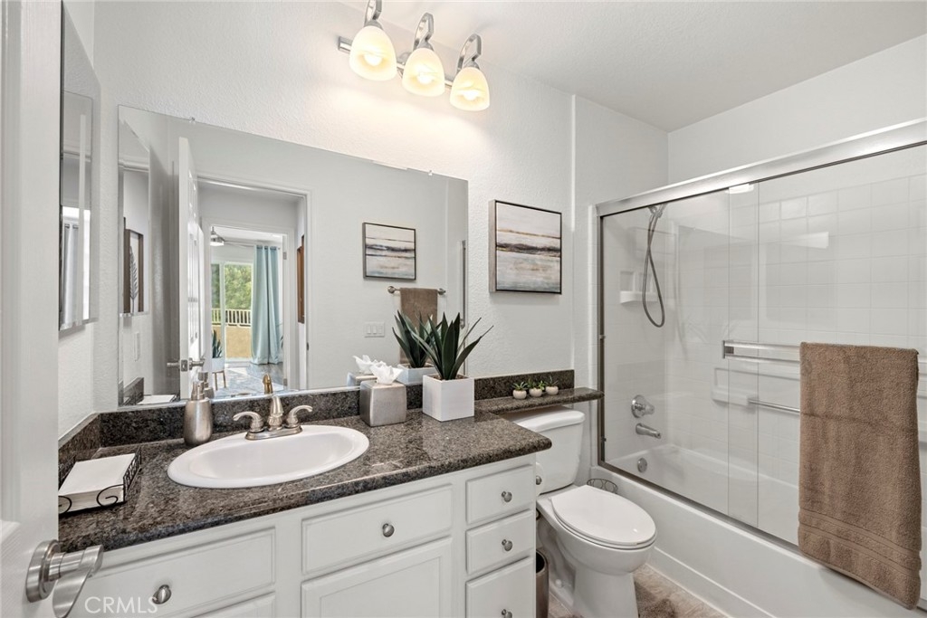 Nestled in the foothills of the Cleveland National Forest, this gorgeous top level end unit condo has it all! Premier location in the rear of the complex gives you that coveted unobstructed view of the foothills from nearly every room as well as from your extra-large partially covered balcony accessed from both the living room and secondary bedroom. Open concept floor plan with vaulted ceilings is drenched in all day natural light from the abundant windows and features two bedrooms on opposite ends of the home to provide exceptional privacy. Great room living offers a cozy fireplace, nice sized dining area and updated kitchen with bright white cabinets, granite counters, stainless appliances, breakfast bar and huge walk-in laundry/pantry. Beautiful laminate wood floors with upgraded baseboards, plantation shutters, new sliding doors and cool tone paint extend throughout the living areas and bedrooms, each with their own expansive walk-in closets. Bathrooms have also been upgraded with granite vanities and newer glass enclosed shower tub combos. Private parking includes one covered and one uncovered space and is conveniently located adjacent to the building, plus a large storage closet off the balcony. Sage Canyon provides an exceptional living experience for its residents and offers a clubhouse, large pool, spa, basketball and volleyball courts, and state-of-the-art gym. Easy access to local shopping and dining as well as just one exit off the 91 if you’re headed to the OC.