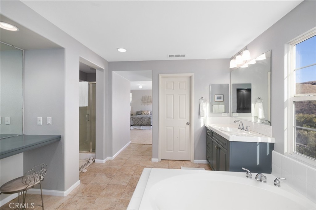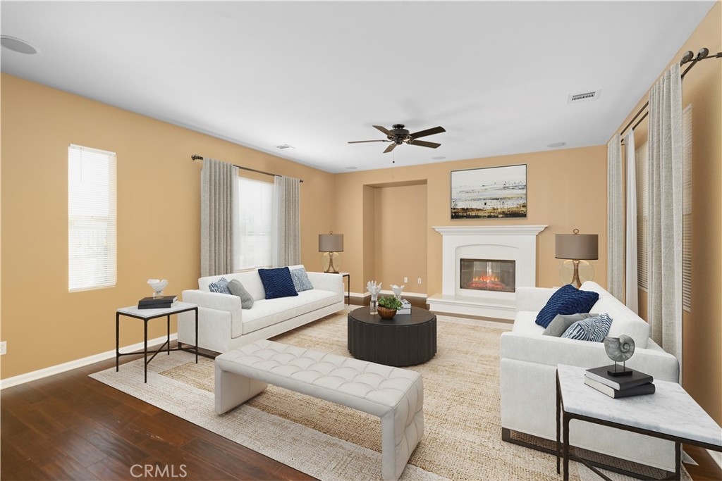Looking for a home in the Dos Lagos gated community? Look no further, this home is one of the few in the community that has spectacular views of the Dos Lagos Golf course. It is a Spanish style home with a Santa Barbara flair and features 4 bedrooms, 2.75 baths, has 3,413 sq ft (living), a large upstairs loft, a separate office area, large laundry room with a utility sink and lots of storage, a gourmet kitchen with a large island, stainless steel double oven, microwave, range & included a walk-in pantry, with direct garage access and a very large laundry room, complete with a utility sink and lots of storage. The home also has two fireplaces, one in the formal living room & the other is the family/great room adjacent to the kitchen, there is also a a formal entryway, a large loft upstairs, a separate office space upstairs, perfect for todays work from home envirement, and a spacious master suite upstairs with a large French door that open to a patio to enjoy the sweeping view of beautiful sunsets and sunrises. The primary suite also includes a primary bath with a sunk in tub, double sinks, a vanity area and a very large walk-in closet. Home is situated on a 7,405 sq ft lot and was built in 2005. Other appointments include a 2 door garage but holds 3 cars since one parking spot is a tandem parking spot, a newly landscaped front and back, outside gas fire pit, hardwood floors, outside separate side courtyard and all in a gated community. Close to all shopping, great restaurants, parks, clubhouse, Eagle Glen Grill, golf course and schools.