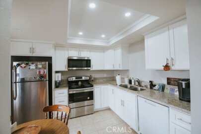 "THE LAKES" Condo! ONE OF THE BEST LOCATIONS IN THE COMPLEX. Walk from parking space to condo with NO STAIRS. Front Porch with planter in front gives space between anyone walking by. Dogs can enjoy the front grass, outside of condo. (leashed) 1 bedroom and 1 bathroom. Granite Counter tops. Front Porch & Private Patio with city park behind the back patio. Beautiful New Wood Laminate Flooring, Tile in Kitchen and Bathroom. Freshly Painted and ready for you From May to September enjoy the pool and paddle boats on the lake and enjoy tennis and basketball (when not shut down by coronavirus). Have fun playing basketball, tennis, volleyball. Commuter Friendly with 91 & 71 freeways. 1 carport with storage assigned. Easy walk to lake . CARPORT with STORAGE INCLUDED