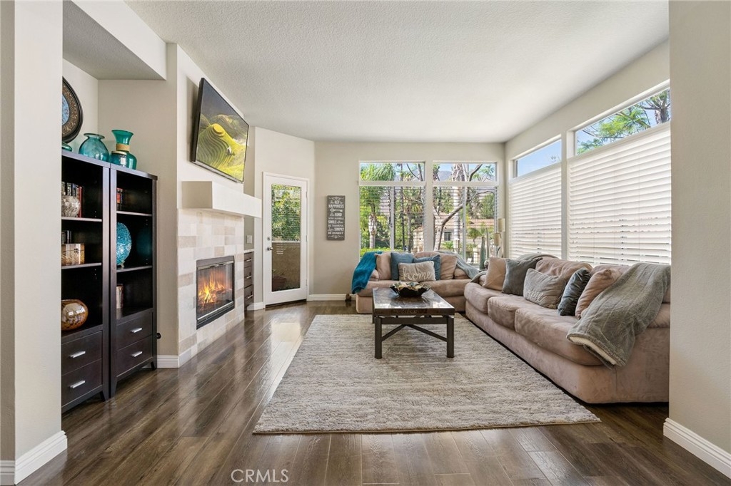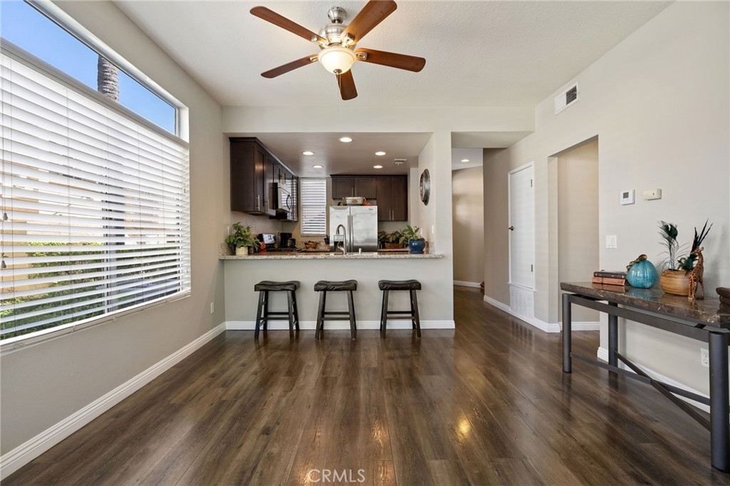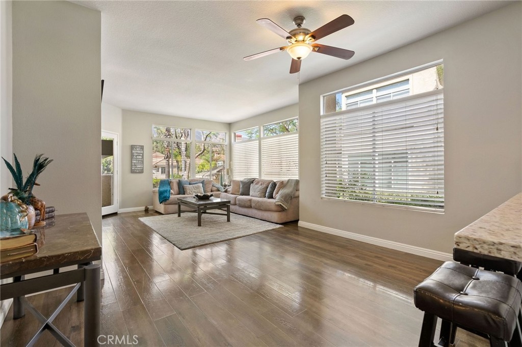 This highly desirable ground floor end unit lies adjacent to the swimming pool and club house yet not too close for noise. the focal point of the living room and dining also includes a dazzling view of the pool and clubhouse. *** Property he is located right off the 91 Fwy Green River Rd exit near Yorba Linda. Located close to elementary school and shopping. ***This two bedroom two bath home shows great pride of ownership, from high ceilings to wood plank style floors throughout. ***Included with this home are stainless steel kitchen appliances stove/oven refrigerator and dishwasher and laundry area includes washer and dryer and also for your peace of mind newer air conditioning and forced air units which have been recently replaced. There is a one car enclosed garage plus an assigned unit outside for additional car, garage also includes built in storage cabinets.