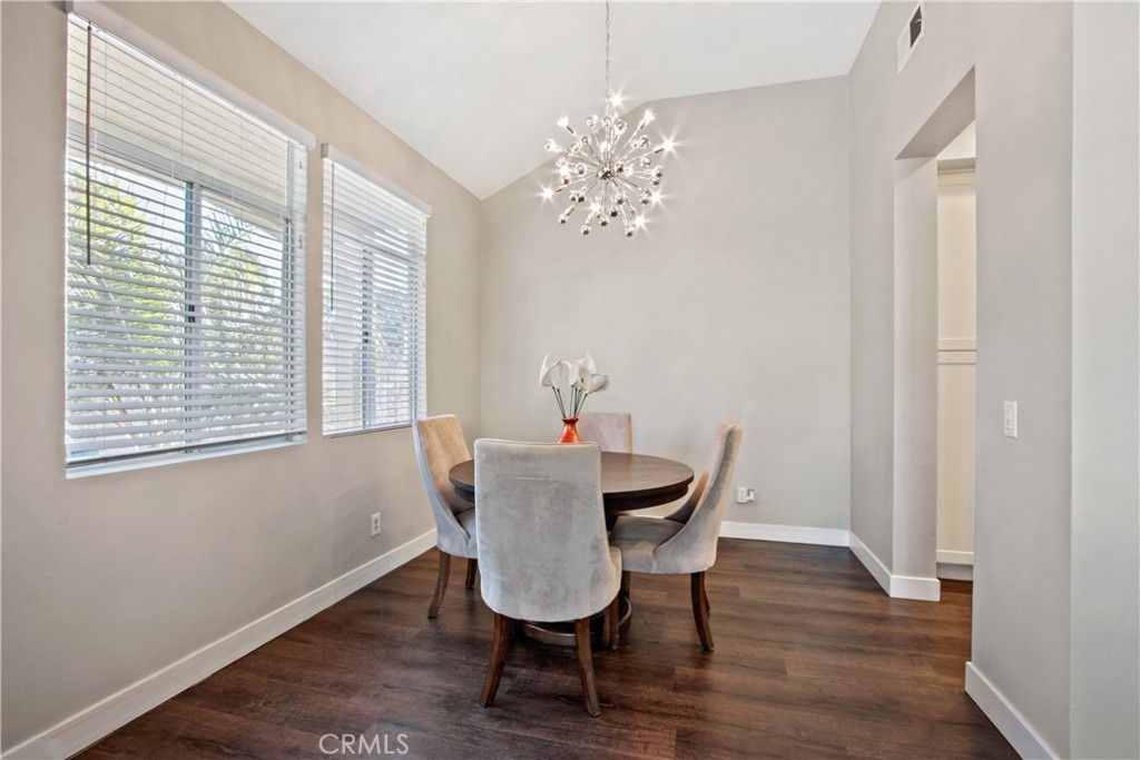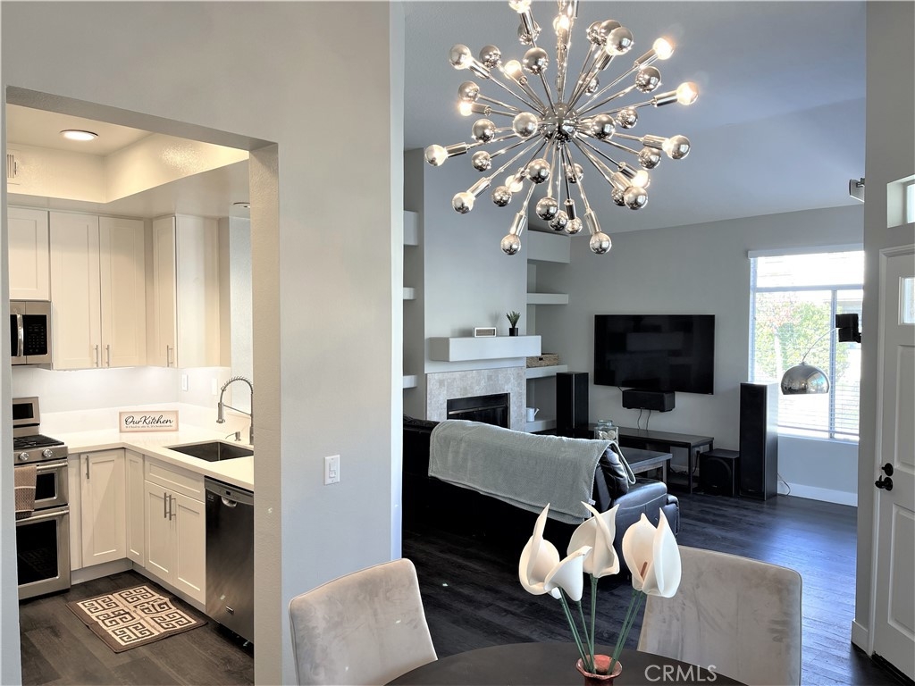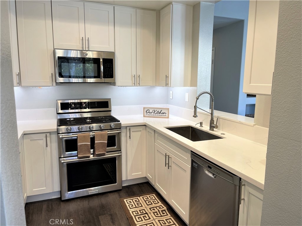 Welcome Home to this Upgraded End Unit conveniently located at Green River - The Terraces Sierra Del Oro. A private stair entrance leads to a turnkey move in ready home offering exclusivity of nobody above or below. As you walk through the front door, you will be welcomed with an open concept layout featuring high ceilings, plenty of natural light, newer wood-style flooring and new paint. The welcoming layout provides a Dining and Living area along with quick balcony access through a large living room sliding door, making gatherings a delight. You will fall in Love with the brand new Kitchen Featuring Quartz Countertops, New white cabinets (soft-closing), lazy Susan Drawers, Stainless steel appliances and Recessed Lighting. Both bathrooms offer a Modern Design new white cabinets, Quartz countertops, elegant design above counter vessel sink and new vanities. This accommodating charmer offers a Nest Thermostat, inside laundry, 1 Private Car Garage and 1 covered Carport space with plenty of guest parking. Nestled in a desired, sought out location with quick Commuter access to 91 Freeways, Toll Roads, Trains, Parks, Hikes, Shopping and Schools, don't miss out on this move in ready home!
