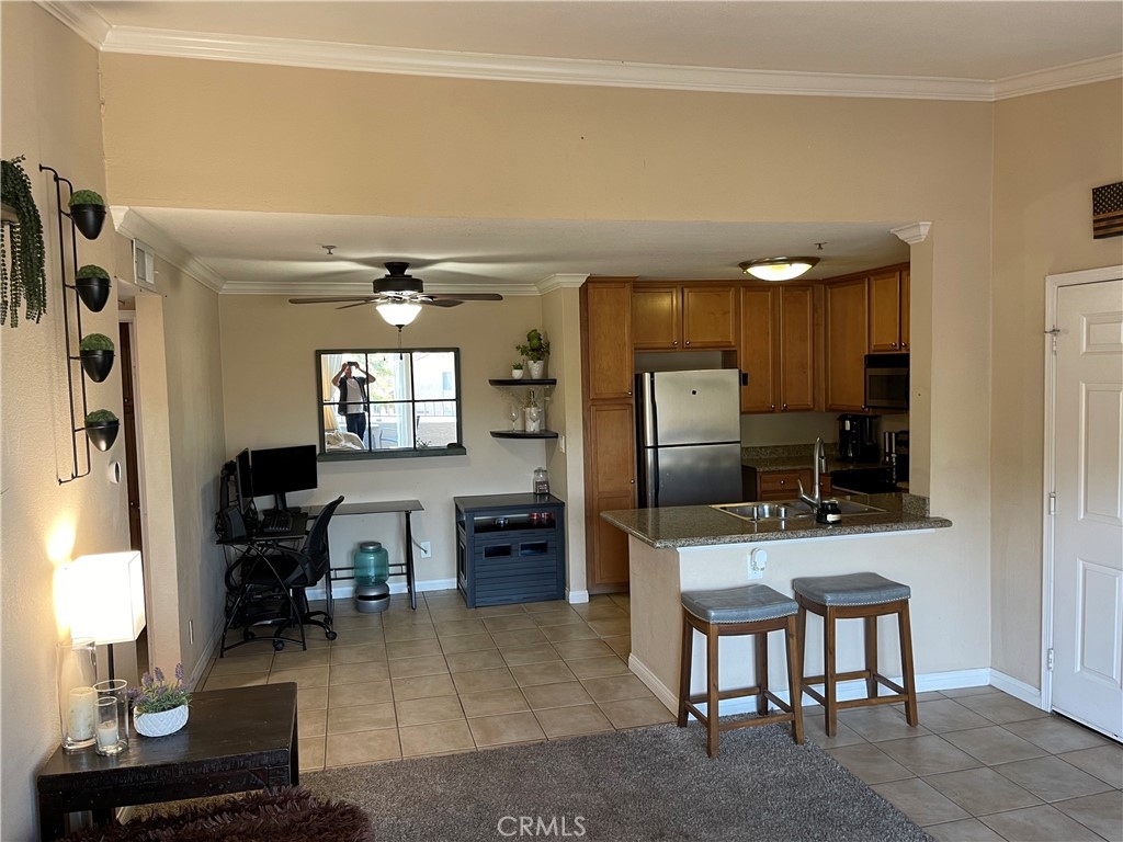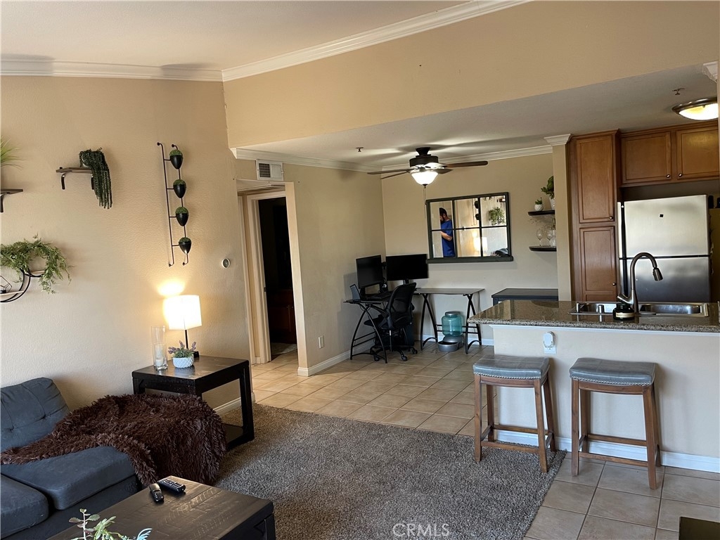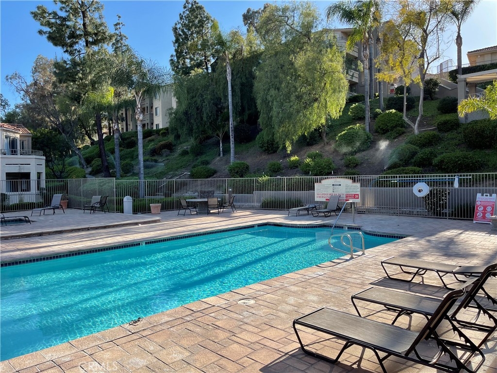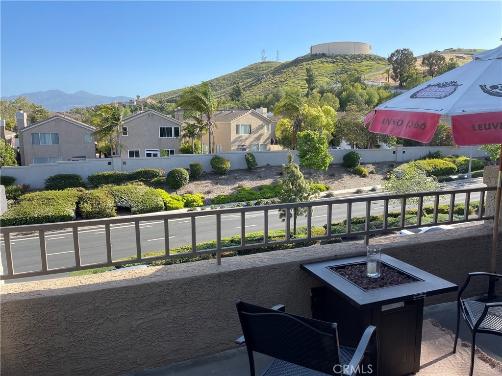 Large corner top floor 1 bedroom and 1 bathroom condo in a highly desirable Corona Ranch neighborhood with sprawling views of the Saddleback Mountains. This home features an open area concept with living, dining and kitchen areas. This is a well insulated unit, you can't hear your neighbor includes central AC/Heat google Nest, vaulted ceiling, stainless steel appliances, granite counters, inside laundry, high speed internet and ceiling fans. 2 large slider doors from the living room and bedroom lead out to a large patio area (18'x7') with mountain views. Master bedroom offers a walk-in closet. Crown molding and baseboards throughout. Tiled floors in kitchen, bathroom, hallway and eating area. Carpeting in the bedroom and living area. This community offers 1 large pool, 2 spas, BBQ area and recreation room with kitchen and pool table. There are several dog areas to take your pet and a park next door. Large garage #246 is 24 feet long and 1 unassigned parking space included.