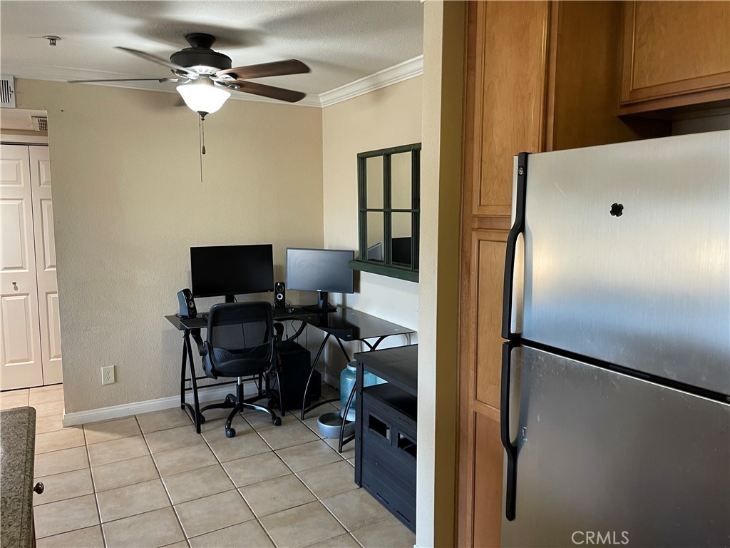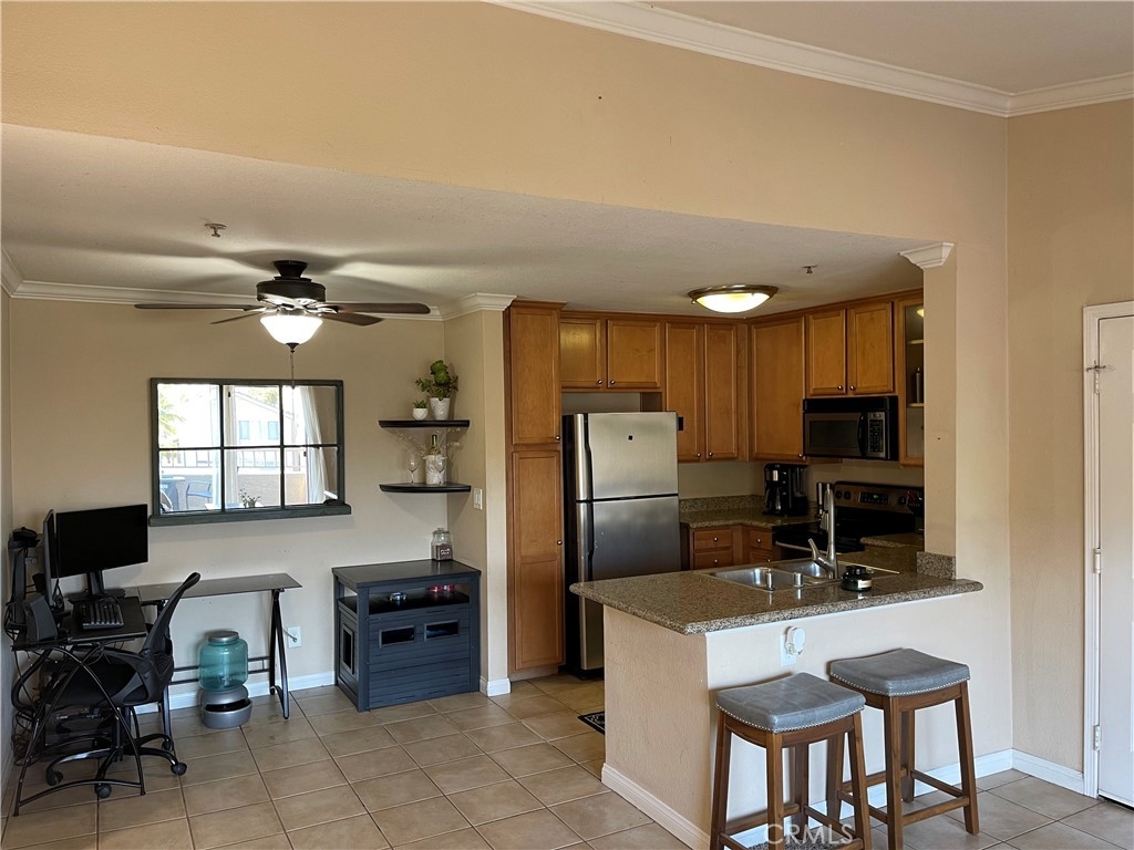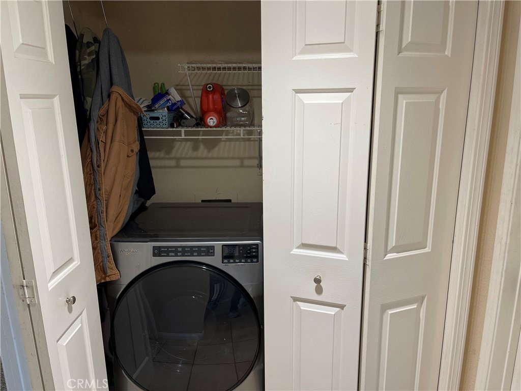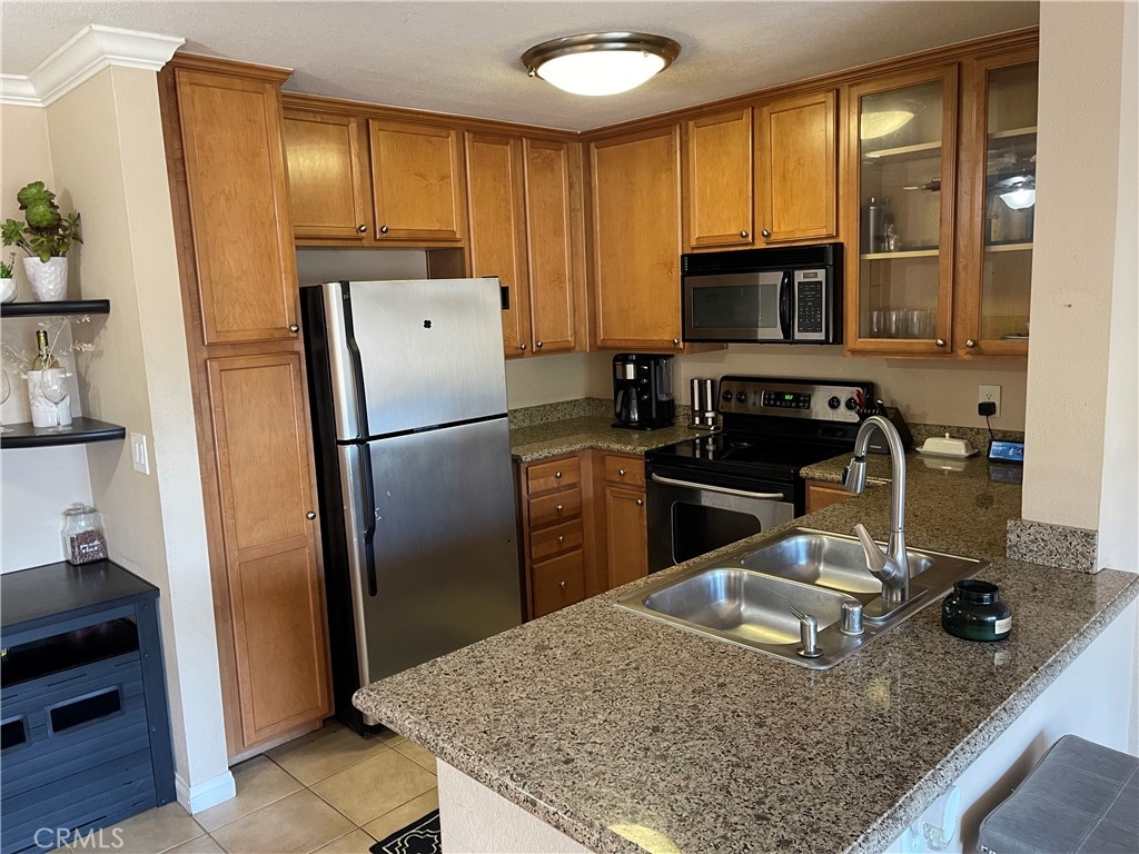 Large corner top floor 1 bedroom and 1 bathroom condo in a highly desirable Corona Ranch neighborhood with sprawling views of the Saddleback Mountains. This home features an open area concept with living, dining and kitchen areas. This is a well insulated unit, you can't hear your neighbor includes central AC/Heat google Nest, vaulted ceiling, stainless steel appliances, granite counters, inside laundry, high speed internet and ceiling fans. 2 large slider doors from the living room and bedroom lead out to a large patio area (18'x7') with mountain views. Master bedroom offers a walk-in closet. Crown molding and baseboards throughout. Tiled floors in kitchen, bathroom, hallway and eating area. Carpeting in the bedroom and living area. This community offers 1 large pool, 2 spas, BBQ area and recreation room with kitchen and pool table. There are several dog areas to take your pet and a park next door. Large garage #246 is 24 feet long and 1 unassigned parking space included.