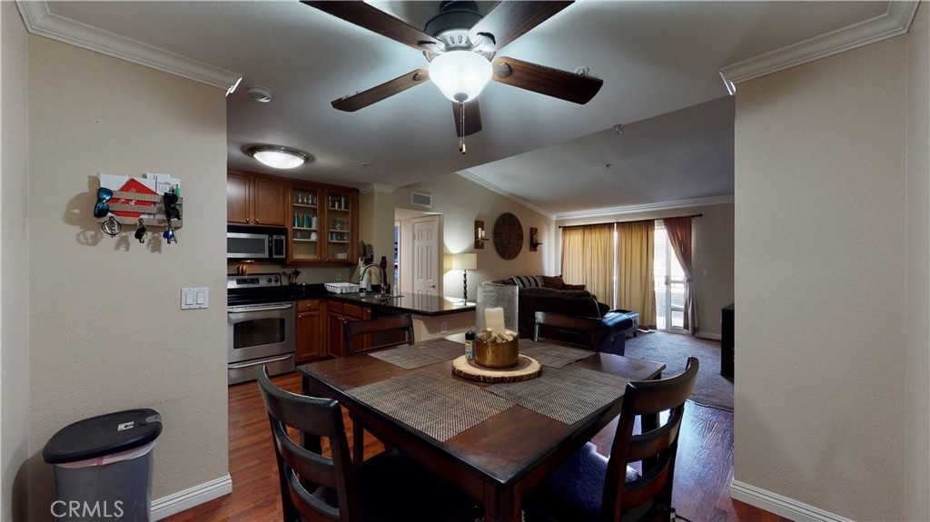 BACK ON MARKET! Buyer could not perform. DO NOT MISS OUT ON THIS BEAUTIFUL HIGHLY DESIRABLE CONDO! This beautiful Corona Ranch condo features 2bedrooms, with a walk-in closet in the master. 2 full bathrooms. This beauty sits high on TOP FLOOR (VERY DESIRABLE) unit. It has 2 balconies, 1 off living room and 2nd bedroom, and 1 off of the master bedroom. 1 detached garage, Granite stone counter tops, Stainless steel appliances, highly desirable laundry in unit, Washer, dryer and refrigerator INCLUDED in the sale. Upgraded bathrooms, Upgraded to NEST Thermostat, very well-maintained community. Features Pool, Spa, Fitness center, Clubhouse with full kitchen, BBQ grill. Close to shopping, Restaurants and easy access to the 91 and 15 FWY. HOA dues include water and trash.
