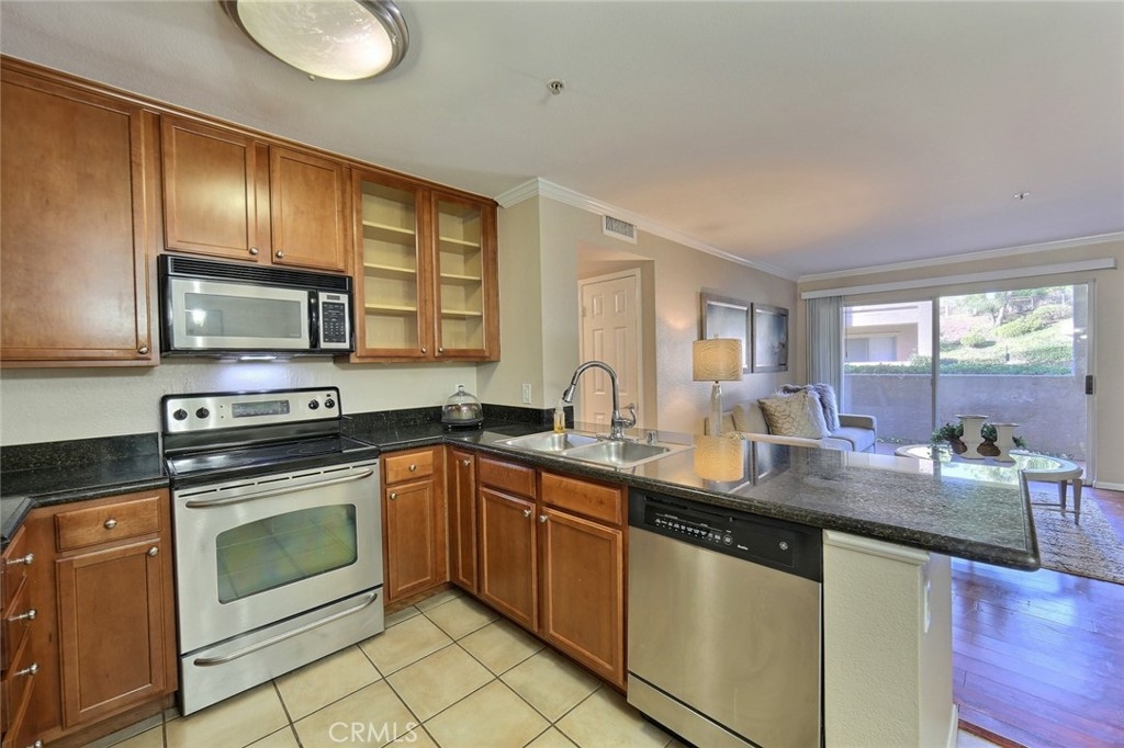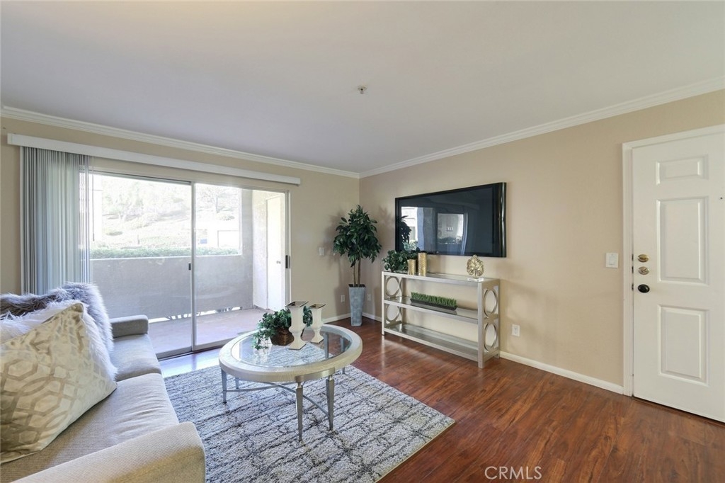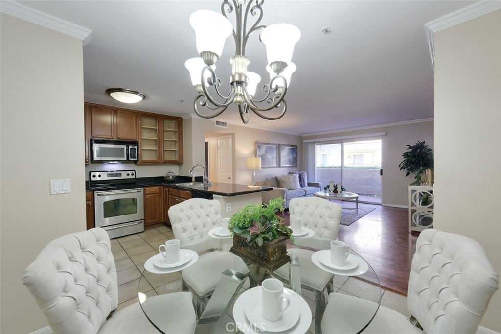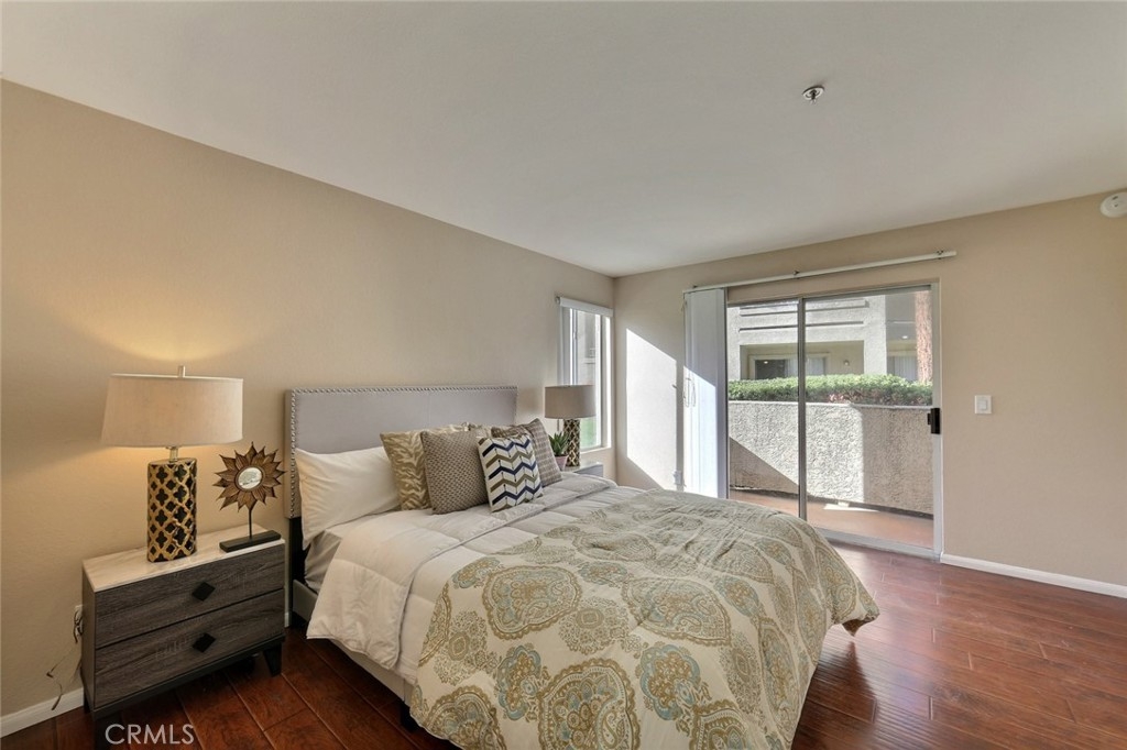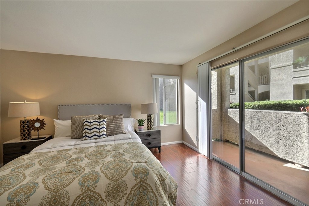 Welcome to Corona Ranch a beautiful first level, end unit condo in the highly sought after gated Triana community. This unit features two bedrooms and two bathrooms, both living room and two bedrooms can directly access to the spacious patio looking out to the beautiful greenbelt. Granite kitchen countertops, upgraded laminate flooring throughout the unit with tiled kitchen and bathroom floor. Newer AC unit was installed just a year ago, and a newer washer was added recently. The unit comes with one detached parking garage. The community offers clubhouse, one large heated pool, two Jacuzzis, BBQ grills, fitness center and volleyball court, as well as 24-hour security service. HOA covers trash and water as well. It has easy access to both 15 & 91 freeways. The major shopping centers and stores are just a couple of blocks away.