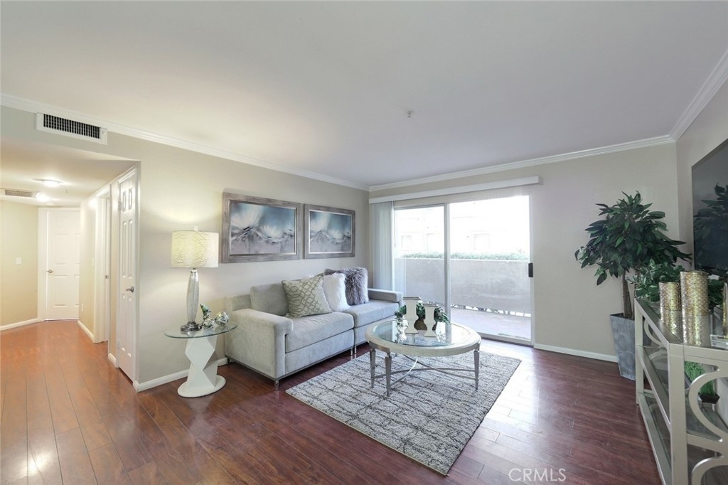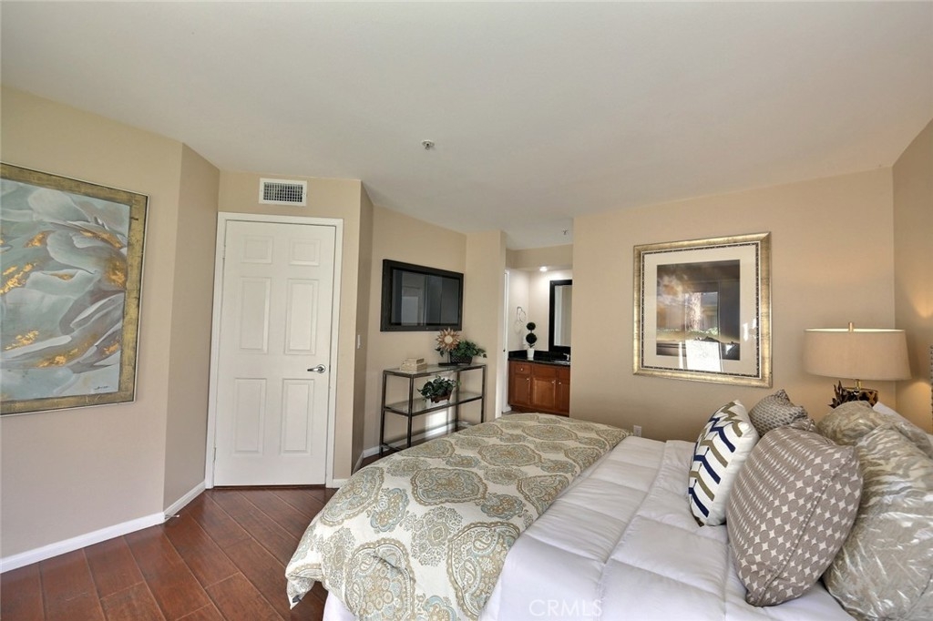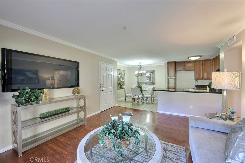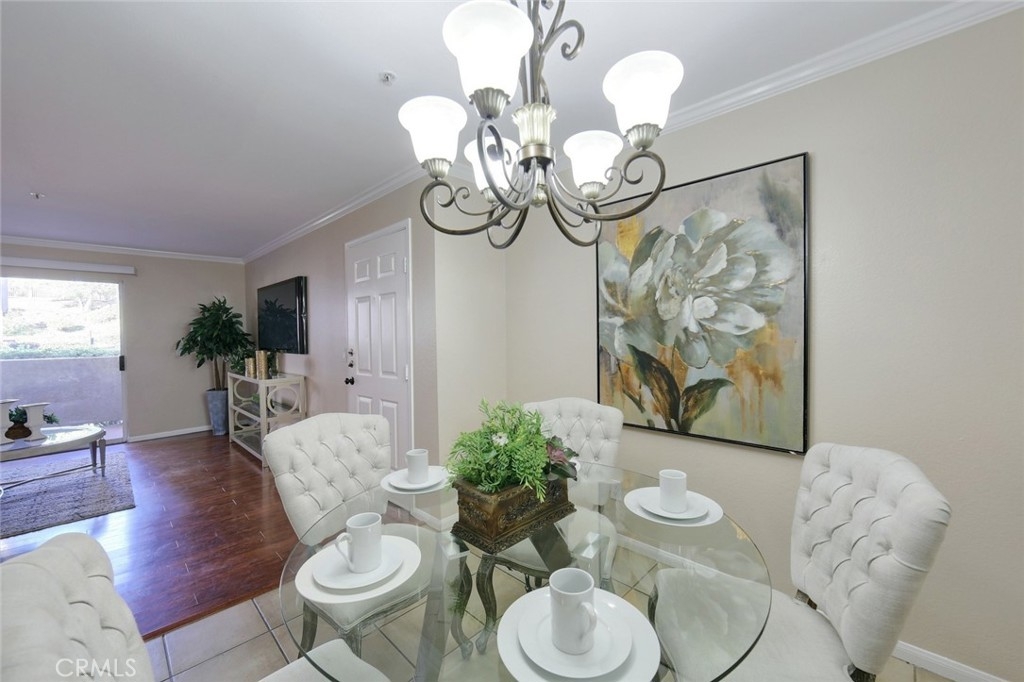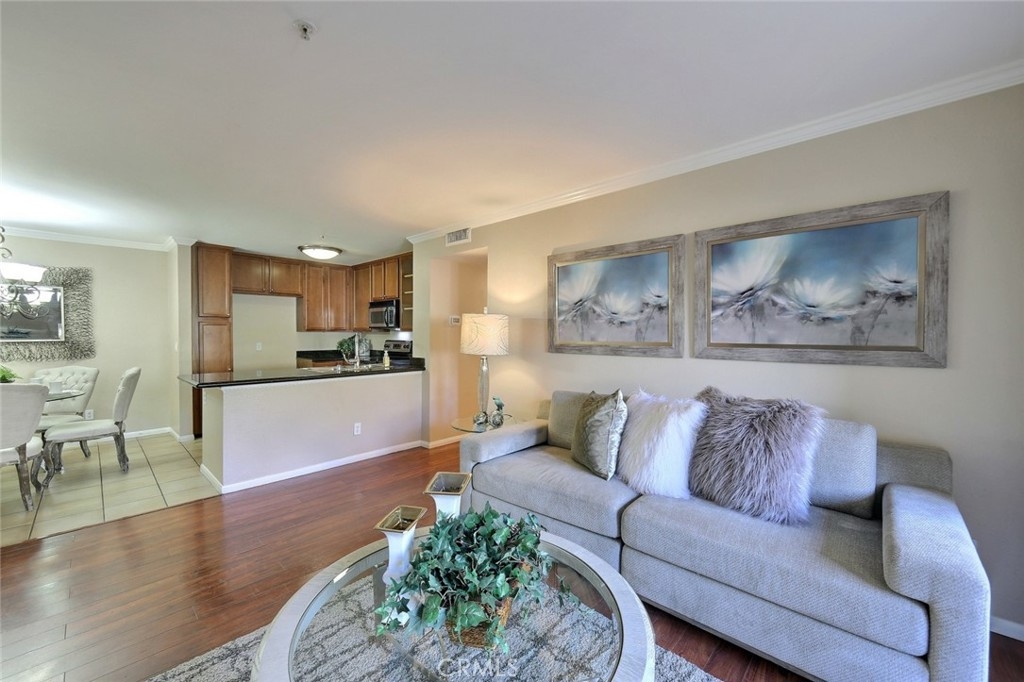 Welcome to Corona Ranch a beautiful first level, end unit condo in the highly sought after gated Triana community. This unit features two bedrooms and two bathrooms, both living room and two bedrooms can directly access to the spacious patio looking out to the beautiful greenbelt. Granite kitchen countertops, upgraded laminate flooring throughout the unit with tiled kitchen and bathroom floor. Newer AC unit was installed just a year ago, and a newer washer was added recently. The unit comes with one detached parking garage. The community offers clubhouse, one large heated pool, two Jacuzzis, BBQ grills, fitness center and volleyball court, as well as 24-hour security service. HOA covers trash and water as well. It has easy access to both 15 & 91 freeways. The major shopping centers and stores are just a couple of blocks away.