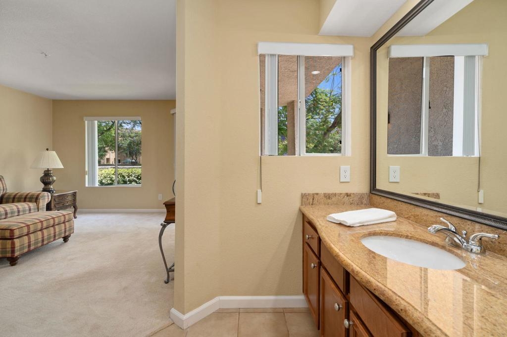 Gorgeous upgraded condo in the upscale community of Triana at Corona Ranch. Highly sought-after first-floor unit that has two bedrooms with two en-suite bathrooms. The kitchen has granite countertops and stainless steel appliances. There is a separate dining area as well. Open concept floor plan with an oversized living room with sliding door out to a spacious patio. The primary and guest bedroom have a private patio and upgraded bathrooms with granite countertops and large walk-in closets. The bathrooms have shower/tub combos with a linen closet. The community is gated with a pool, spa, bbq area, and clubhouse. The association dues cover water, trash and sewer as well as the other amenities mentioned. Don't miss this incredible opportunity to own in the beautiful community of Corona Hills.