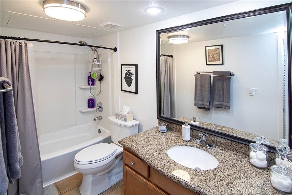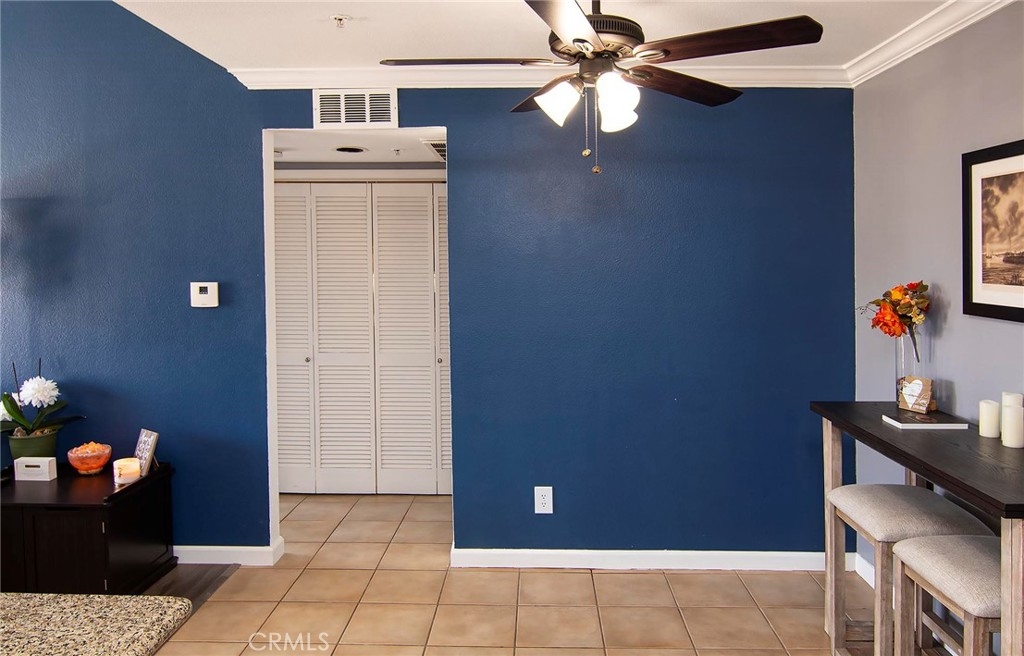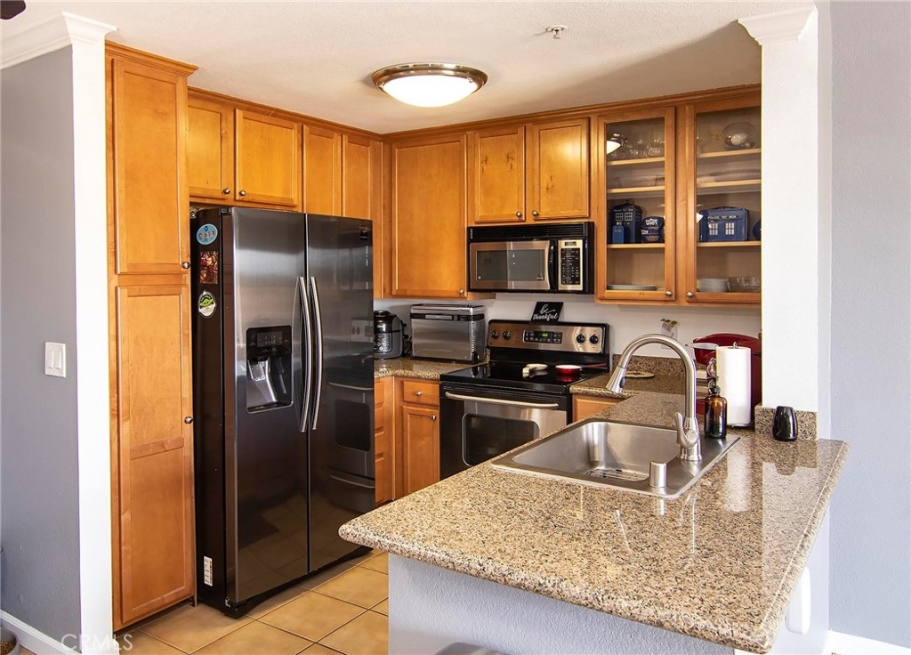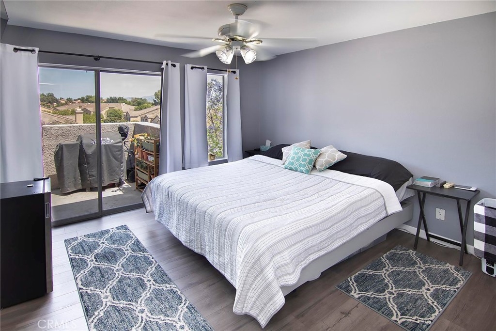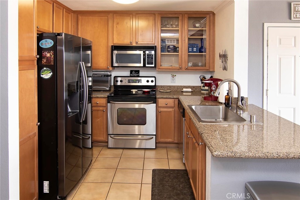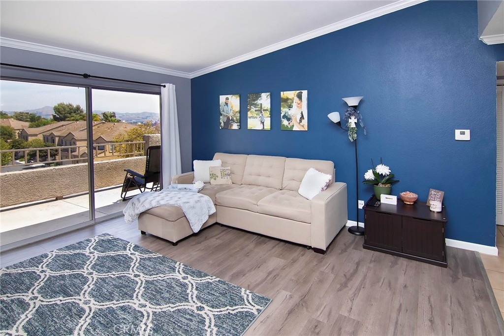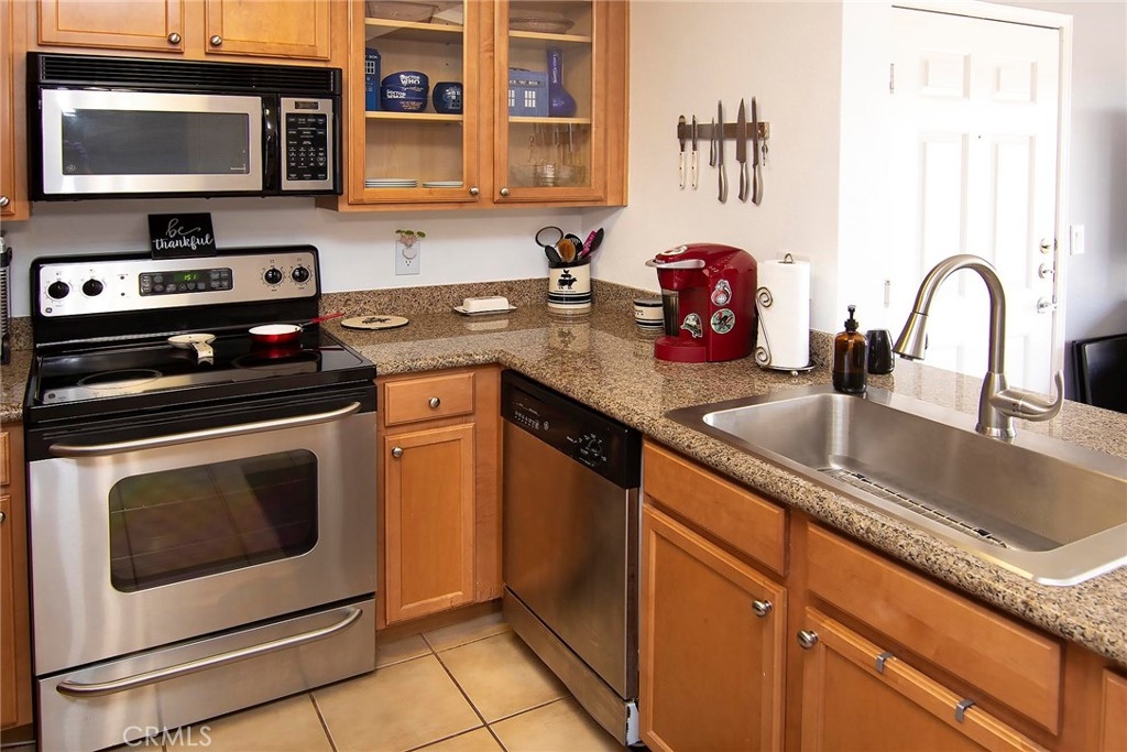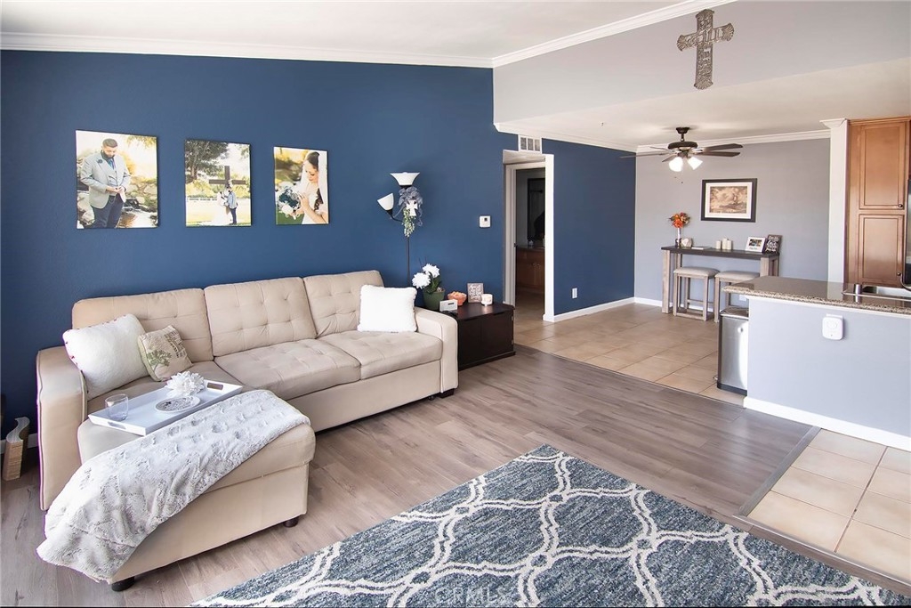 This Gorgeous Upgraded Condo located inside the gated Triana Community in Corona Ranch will impress: with Vaulted Ceilings in front living room, perfect designer color palette, crown molding, baseboards, neutral distressed laminate flooring, breathtaking views of rolling ranch hills across the balcony, upgraded eat-in kitchen with dining area, gold-speckled granite countertops and honey maple-colored cabinetry, inside lighted laundry closet, spacious bedroom with ceiling fan, lots of natural light, 2nd large slider leading to huge exterior patio, and walk-in closet. Large upgraded bathroom with new shower/tub combo will delight featuring neutral colors, granite countertop and maple-colored vanity. This impressive, upscale community with pool, spa, fitness room, BBQ area & Club house includes sewer, water & trash, is close to schools, freeway, and shopping, and could be your new home!