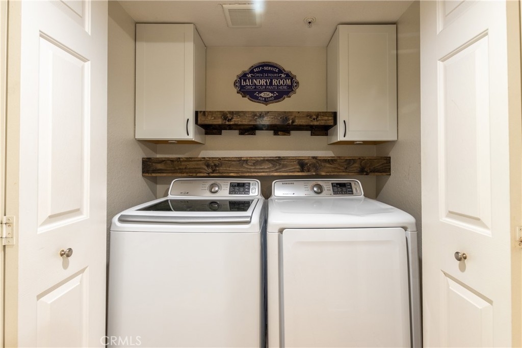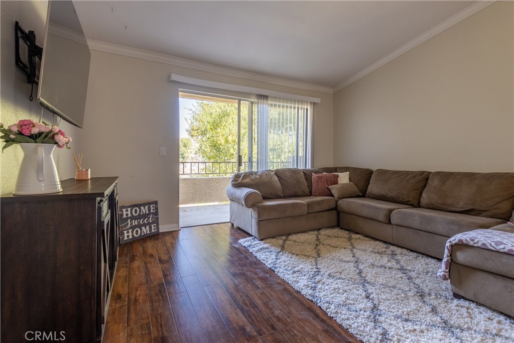 Rarely available 1 bed 1 bath top floor condominium in the highly desirable gated community of Triana. Enjoy your morning or evening relaxing on your private balcony with a beautiful park view that is accessible from the living room and bedroom! There are upgrades throughout this home with an open living area, spacious bedroom, bathroom, and walk in closet. The kitchen has stainless steel appliances with an included fridge, granite counters, and maple cabinetry with glass doors. The bathroom has been upgraded with granite countertops and a tiled shower. The living area has plenty of natural light, crown molding throughout, A/C, and upgraded laundry closet with in-unit washer and dryer hookups (washer & dryer included). Your property also includes a covered parking space, and there is plentiful guest parking within the community. The HOA dues include outside maintenance of the buildings, insurance, water, trash, and sewer. Enjoy life in this gated community with resort-like amenities including a large pool, spa, barbeque, fitness center, and clubhouse near the 91/15 freeways, shopping, restaurants, and the metro.