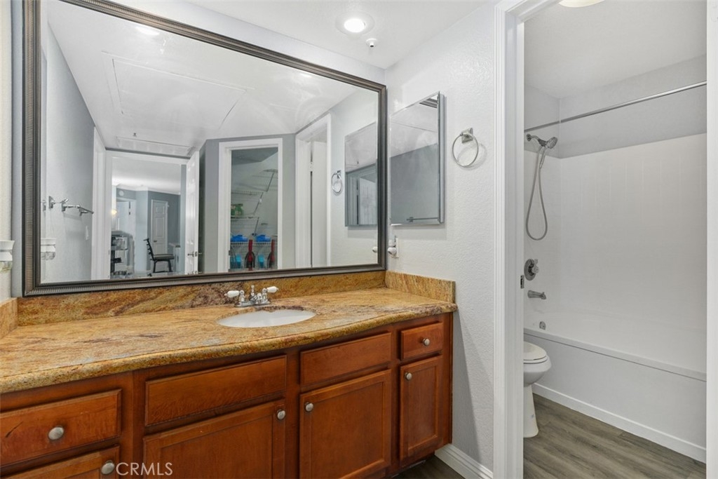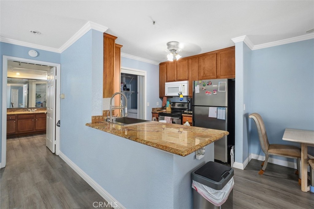 Welcome to this beautifully updated two-bedroom, two-bath condominium located in the desirable community of Corona Hills. Offering 1,063 square feet, this is the largest two-bedroom floor plan available in the community. Designed with comfort and style in mind, this home features an open-concept layout with luxury vinyl plank flooring throughout, complemented by upgraded baseboards, elegant crown molding, and a granite counters in the kitchen. The refreshed bathrooms add a modern touch, providing a move-in-ready experience. Each bedroom offers the luxury of a private balcony, perfect for relaxing, unwinding, and enjoying the fresh air. Additional highlights include a private garage, in-unit washer & dryer (included), along with ample guest parking within the gated community. Residents enjoy access to premium HOA amenities, including a fitness center, recreation facility/club house, a sparkling pool, and 2 spa areas. The HOA also covers water, trash, and natural gas, all reducing your monthly living expenses. Conveniently located near shopping (Costco, Home Depot, & Walmart), multiple dining choices, a city park on the adjacent property, minutes from Corona Metro train station, and 2 major freeways, this condo is ready to welcome you home and service all of your needs. Welcome home!