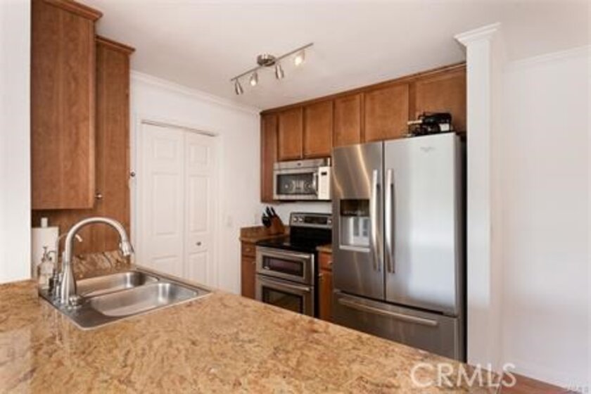 This wonderful unit offers 2 bedrooms and 2 bathrooms. This condo is nestled in the highly sought after "Triana" community in the Corona Ranch area of North Corona. The free flowing floor plan offers a comfortable living room and formal dining area, 2 remodeled bathrooms with granite countertops, large oversized soaking tubs and custom mirrors. An upgraded kitchen with granite counter tops, stainless steel appliances, water filter and custom lighting. The unit has two balconies for viewing the hillside, along with a 2 car detached tandem garage. The home also features updated base boards, crown molding, updated ceiling fans, and fixtures throughout. An inside laundry area with overhead cabinets. Photos show hardwood floors, unit now has carpeting. This is where you can take your shoes off and feel at home. Very comfortable layout.