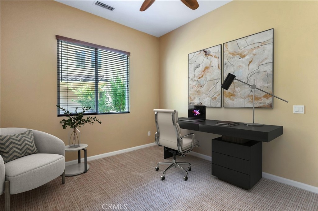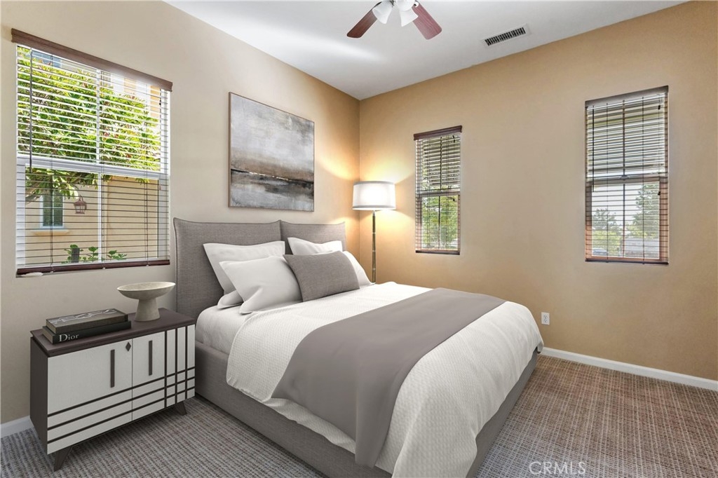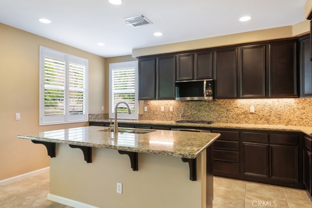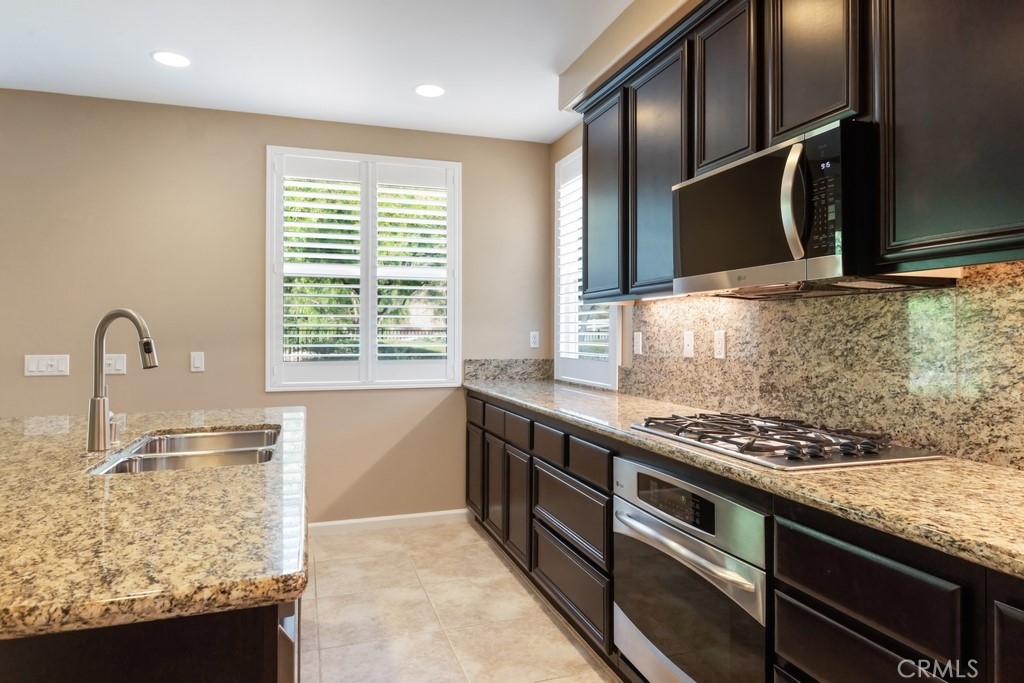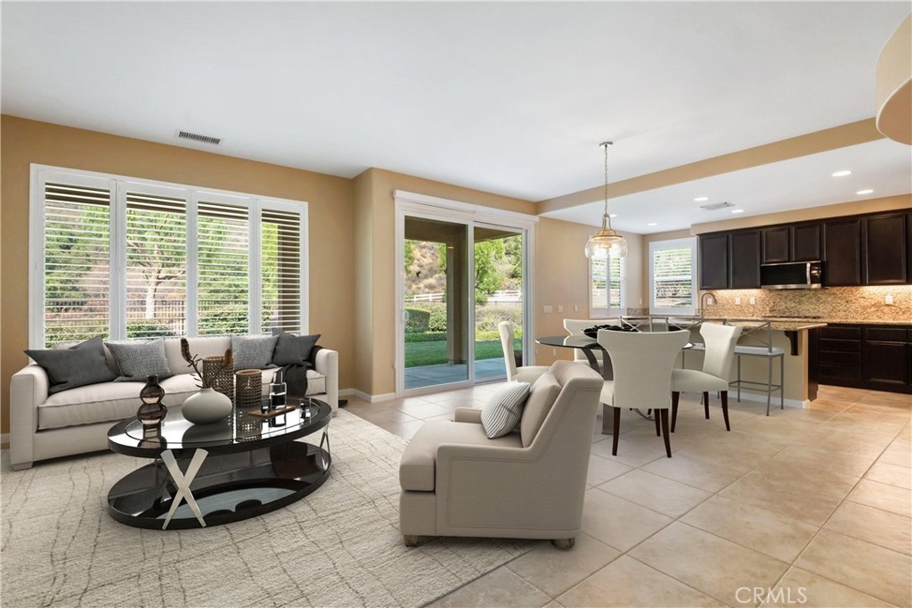 Gorgeous 2 bed, 2 bath condo located in the highly desirable 55+ gated community Trilogy at Glen Ivy! This stunning home is nestled up against the foothills, with no rear neighbors, offering fantastic panoramic views, with lots of seclusion and privacy - it is the most coveted lot in Cobblestone Canyon and this is one of the largest lot in the community! The interior is open and spacious with plantations shutters, recessed lights, tile and carpet floors. The formal rotunda entry opens to the spacious great room with fireplace, there is a slider to the backyard, a dining area, and the stunning kitchen features a large center island with granite counters, matching backsplash, and stainless steel appliances with brand new dishwasher and microwave. The bedrooms offer lots of privacy and sit on either side of the home. The large primary suite has a private bathroom with dual sink vanity, and full-size walk-in shower. There is also a bonus room that could be used as an office or work out area that sits between the entry and the secondary bedroom. A hall bathroom and an in-unit laundry room complete the floor plan. Enjoy the park-like backyard with covered patio, lush landscaping, with well kept grass and phenomenal foothill views - this is the perfect space for entertaining guests! This home also offers an attached 2-Car Tandem Garage, and resident's get to enjoy an array of Resort-like amenities including banquet facilities, club house, rec room, fitness center, golf course, pool, spa, pickleball and tennis courts, plus many community events. Schedule your private tour today and do not miss out on this gem!