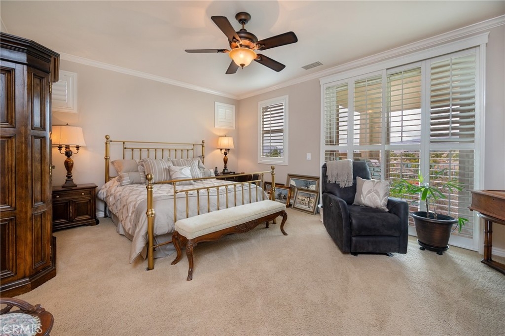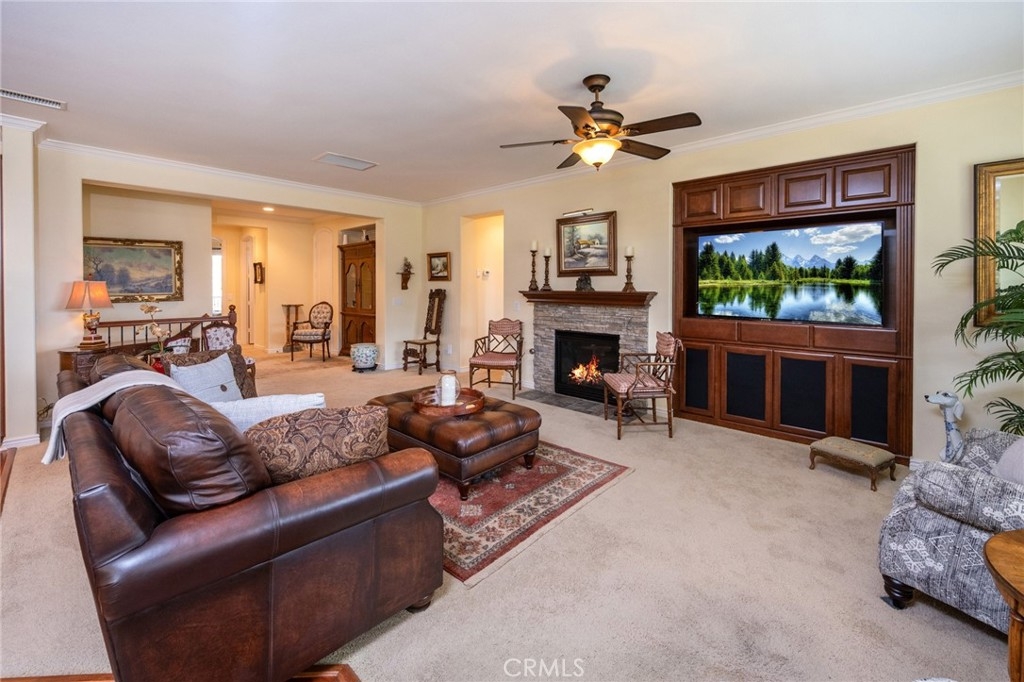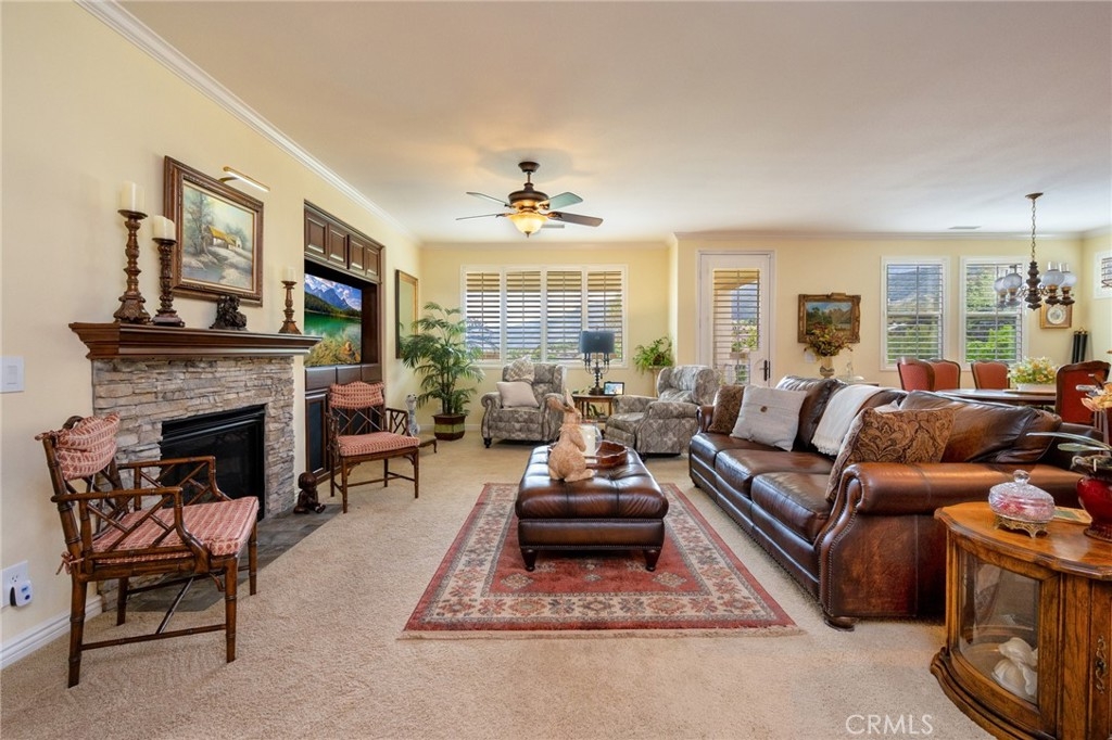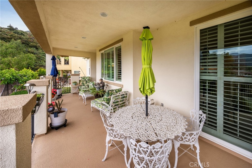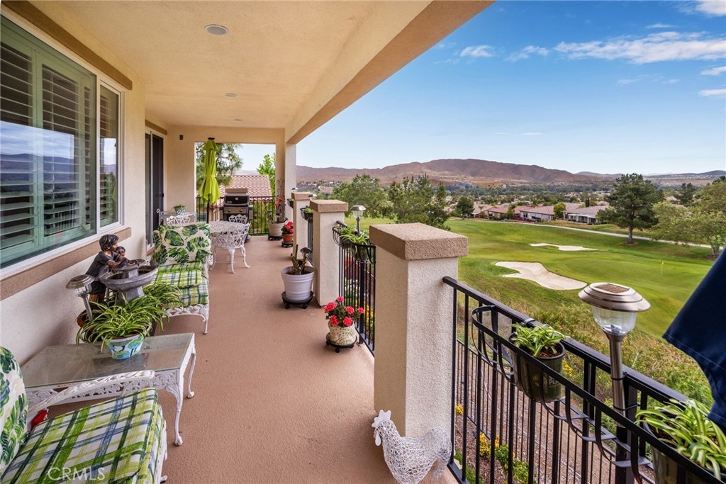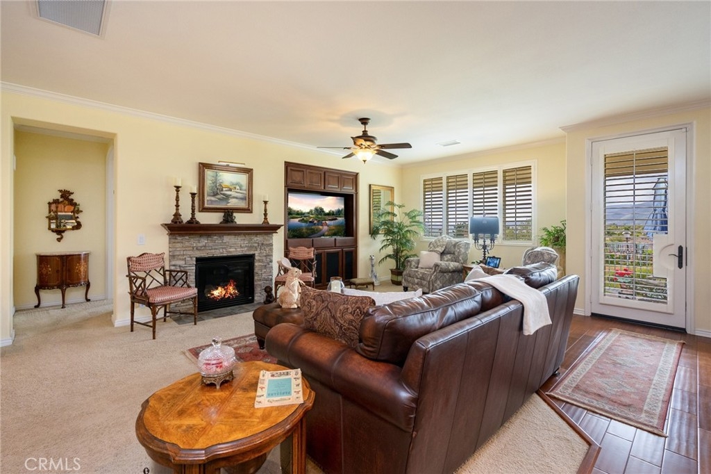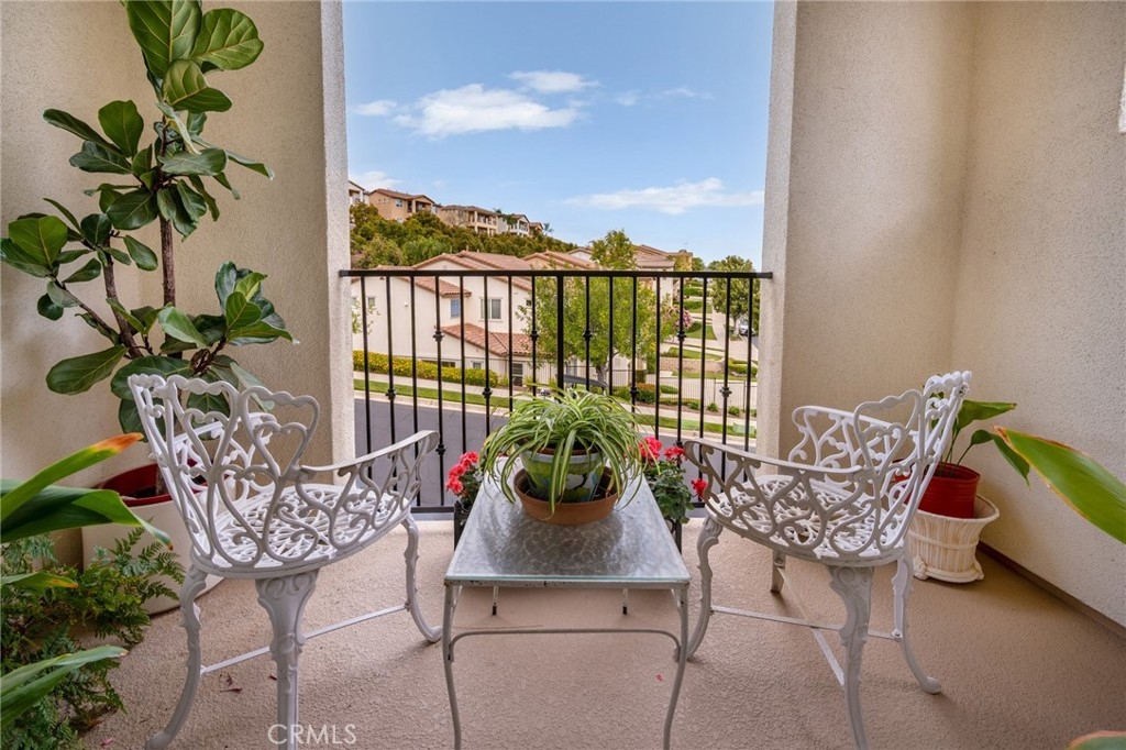 STUNNING TRILOGY CONDO WITH PANORAMIC VIEWS. Priced to sell! Don't miss this one. It's in a great location and is the largest model of the Trilogy condos with 2051 sq ft. It features an open floorplan with fantastic kitchen, dining area and family room with fireplace. There are 2 great bedrooms, 2 1/2 bathrooms, a bonus retreat area perfect for office, indoor laundry and your own elevator. The super wide covered balcony looks south over the Glen Ivy Golf Course, the entire Temescal Valley and mountains of the Cleveland National Forest! The guest bedroom has it's own private covered balcony looking north. Interior features include crown molding and plantation shutters throughout. The entire unit is tastefully decorated with upgraded granite counters with tile backsplash and stainless-steel appliances in the kitchen. The primary suite has a walk-in closet with built-in storage, walk-in tiled shower and dual vanities and tile counters. Trilogy is a fantastic 55+ community with loads of activities and amenities. There's a great resort pool and hot tub with BBQ's and fireplace. Enjoy summer concerts at the outdoor Amphitheater! The Blue Water Sports Lodge has a great work-out gym with updated equipment, a walking track and indoor lap pool. There's also tennis, pickleball, bocce ball, cards, ceramics room, card room, banquet facilities, and the list of fun activities goes on. Come live in Trilogy! You'll be glad you did!