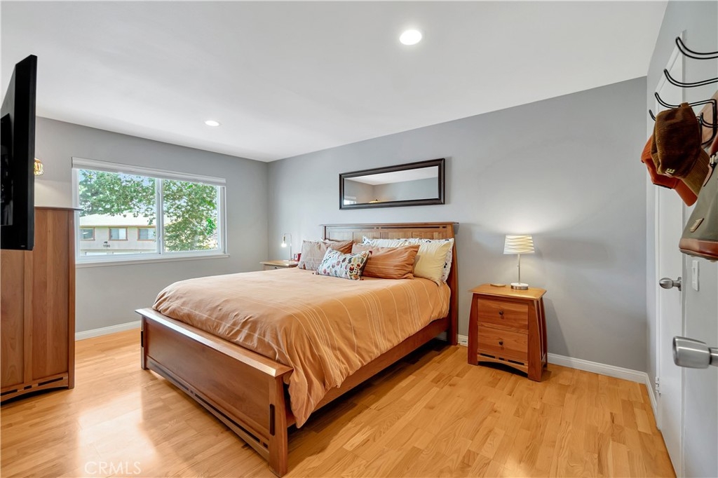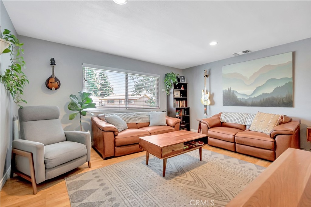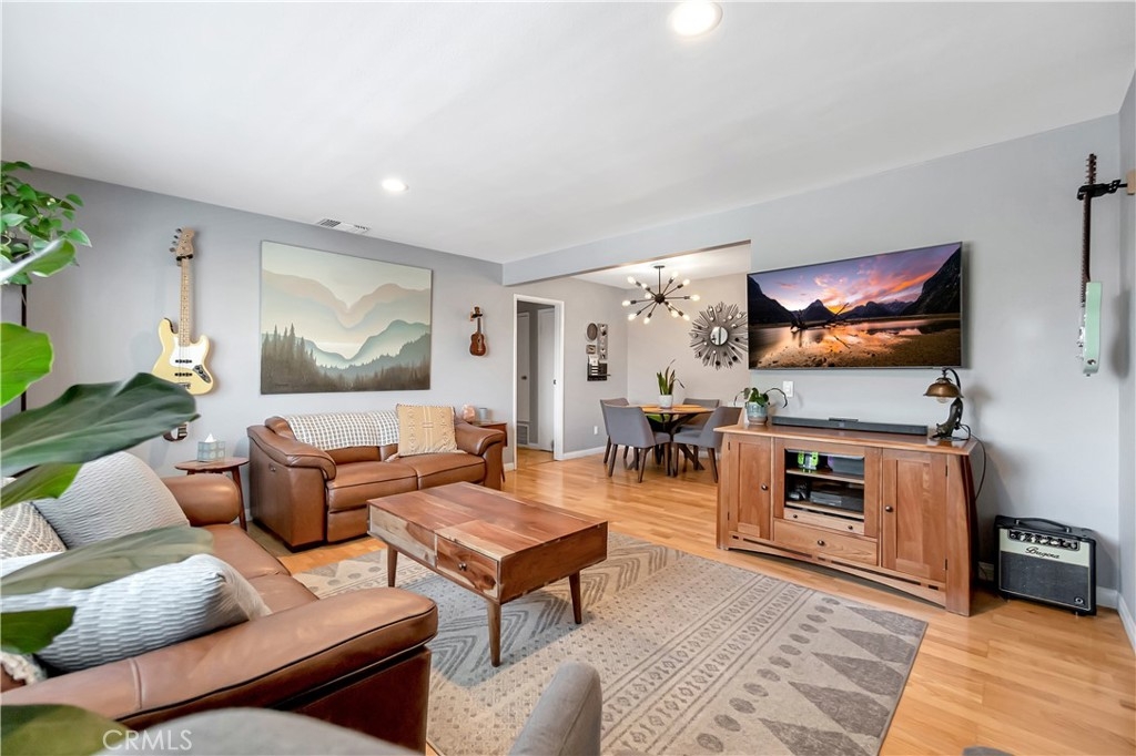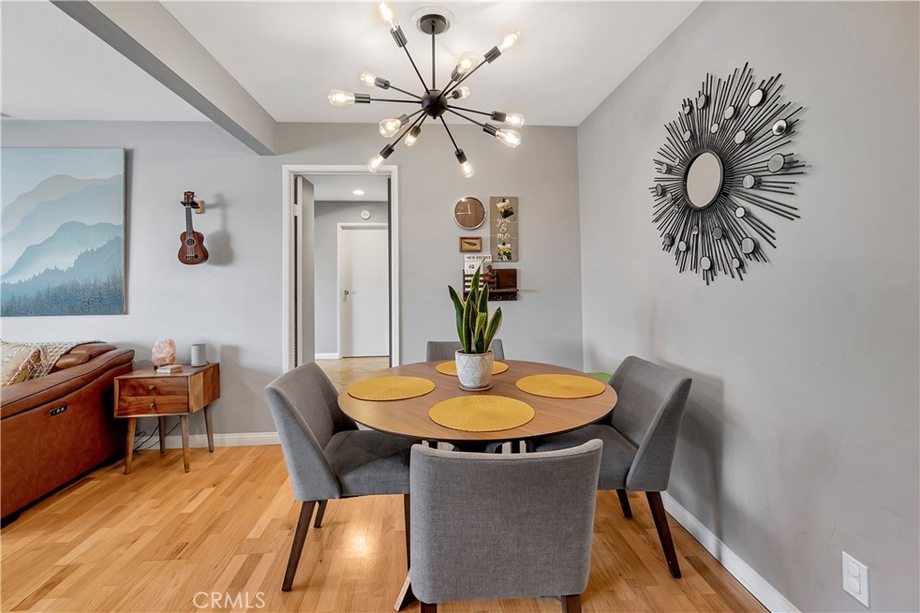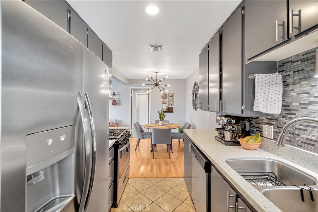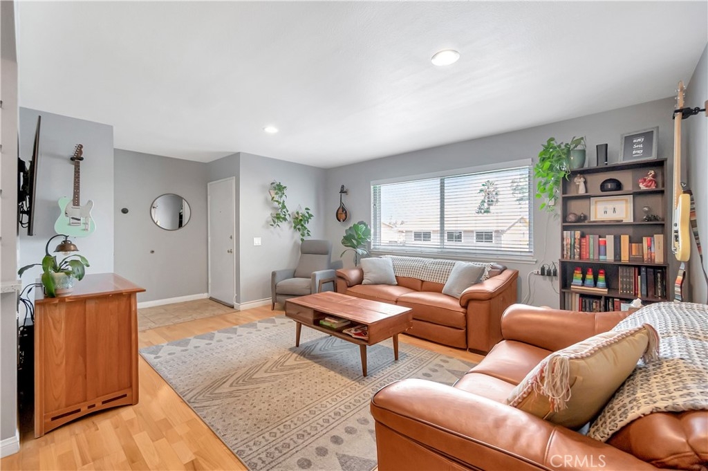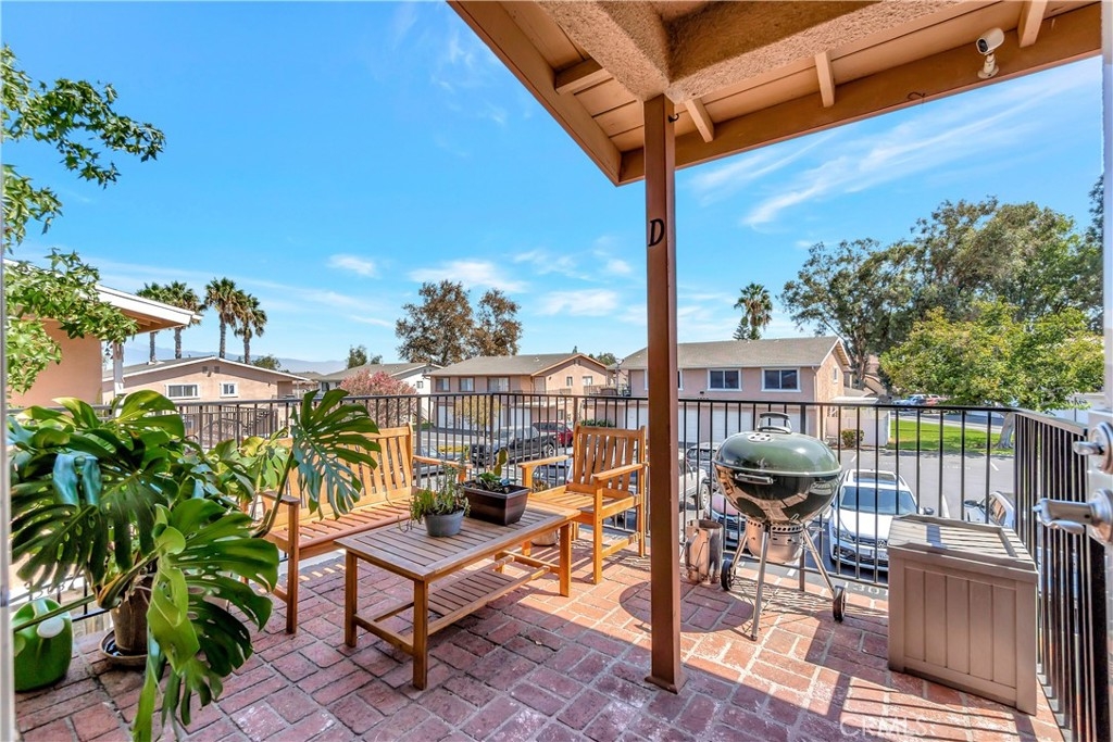 Welcome to the Village Groves Community! This updated 2 bedroom,1 bath condo is ready for you to call it home! This upper level unit (no one directly below), invites you in with narrow plank wood flooring throughout the living space and bedrooms. The living room enjoys plenty of natural lighting and is open to the dining area and kitchen. The galley kitchen features gray cabinets, quartz countertops, stainless steel gas range and dishwasher! The gray cabinets and quartz counters are also featured in the full bath complete with shower/tub combo. Both bedrooms feature blackout shades and the spacious primary bedroom includes a walk in closet. Outside you can enjoy warm Corona evenings on your private brick paved patio. Other amenities include: central a/c and heating, Nest thermostat, recessed lighting, 1 car garage plus 1 assigned parking space.  This home has Village Grove Lake access where you can spend days paddle boating or fishing. Included in the Association is a pool, basketball courts, playground and dog park. You're going to love the location! Within walking distance to the local grocery store, donut shop, taco spot and gym plus just a short drive to major freeways, train station, hiking trails and shopping centers. With FHA Approval this home is the one you have been waiting for!