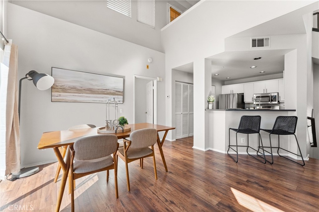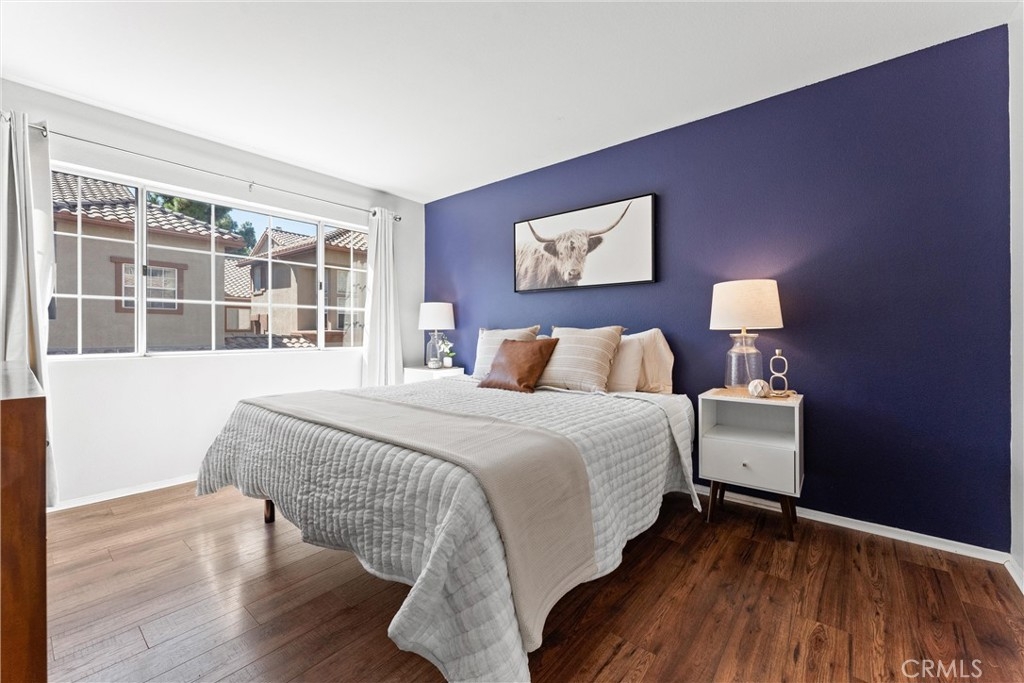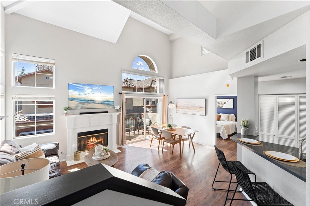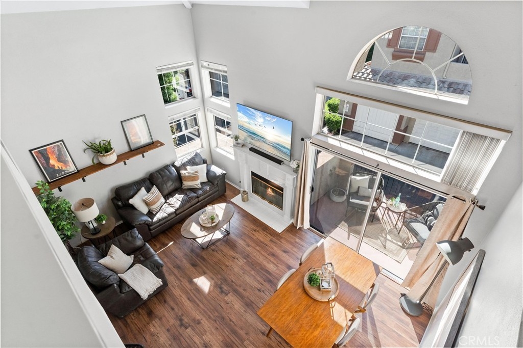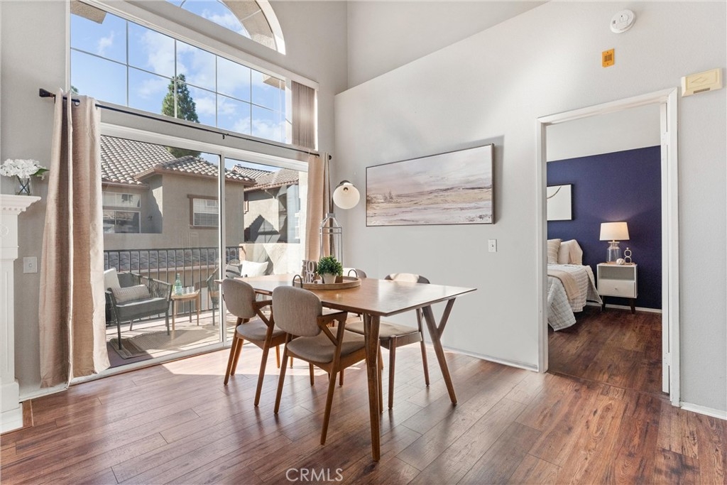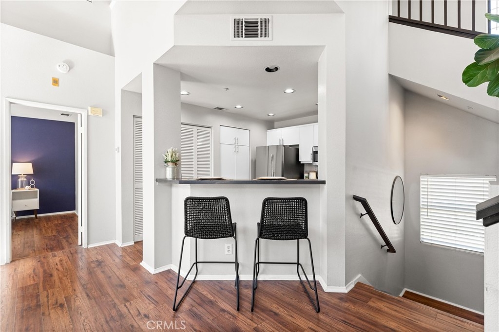 FHA approved! $15,000 Down Payment Assistance grant available for qualified buyers. Welcome to this beautifully upgraded two-story condo in the desirable Villaggio community of North Corona. Whether you’re a first-time homebuyer, looking to rightsize, or seeking a strong investment opportunity, this home offers the perfect blend of style, comfort, and convenience. As you enter the home you’ll find durable engineered wood flooring, vaulted ceilings, and an abundance of natural light streaming through the open floor plan. The dining area opens to sliding glass door that lead you to an inviting first-level balcony, seamlessly blending indoor and outdoor living. The main level features a generously sized bedroom with a private ensuite bathroom, dual sinks, quartz countertops, and a walk-in closet. Upstairs, a spacious loft offers endless possibilities to use as a second bedroom, home office, gym, or creative studio. The loft level also includes a private bathroom with step-in shower, quartz countertops, and a private secondary balcony for enjoying quiet outdoor moments. The spacious kitchen is designed for everyday living and entertaining, with an abundant of storage, quartz countertops, stainless steel sink, stainless steel appliances, Samsung refrigerator that is included with the home. An in unit laundry closet with additional storage located on the main level. Additional highlights include a private one-car garage located directly below the unit, along with convenient open carport-style parking. This corner unit is exceptionally private with no one above or below and only one shared wall. The well-maintained Villagio community provides resort-style amenities, including a sparkling pool, spa, BBQ picnic area, and landscaped greenways perfect for walks, gatherings or unwinding after a busy day. This home offers a convenient lifestyle in one of Corona’s most sought-after neighborhoods. The home is close to shopping and dining yet tucked away among a neighborhood of single family residences. Easy access to both the 91 and 15 freeways. 2925 Via Toscana #202 is an incredible opportunity you won’t want to miss!
