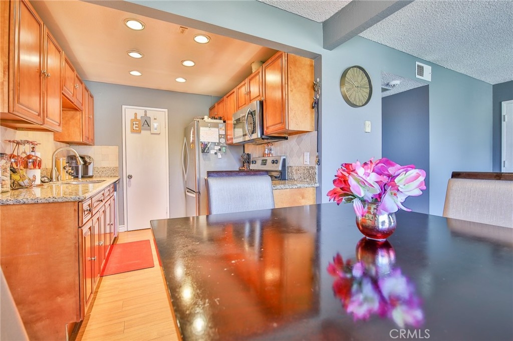 Spacious one bedroom located in the beautiful city of South Corona with the best view in the entire complex. Great home for a first time home buyer. Upper level unit features a spacious 1 bedroom, 1 bath with a large walk-in closet. Granite counter tops in both the bathroom and kitchen. Stainless steel appliances, walk-in pantry and recess lighting in the kitchen. Freshly painted with laminate wood flooring throughout. The dining area features a large sliding door that leads to the balcony overlooking the sparkling pool and spa. Best view in the complex. Close to 91 & 15 freeways, shopping and schools. Don't miss out on this gorgeous, affordable started home.
