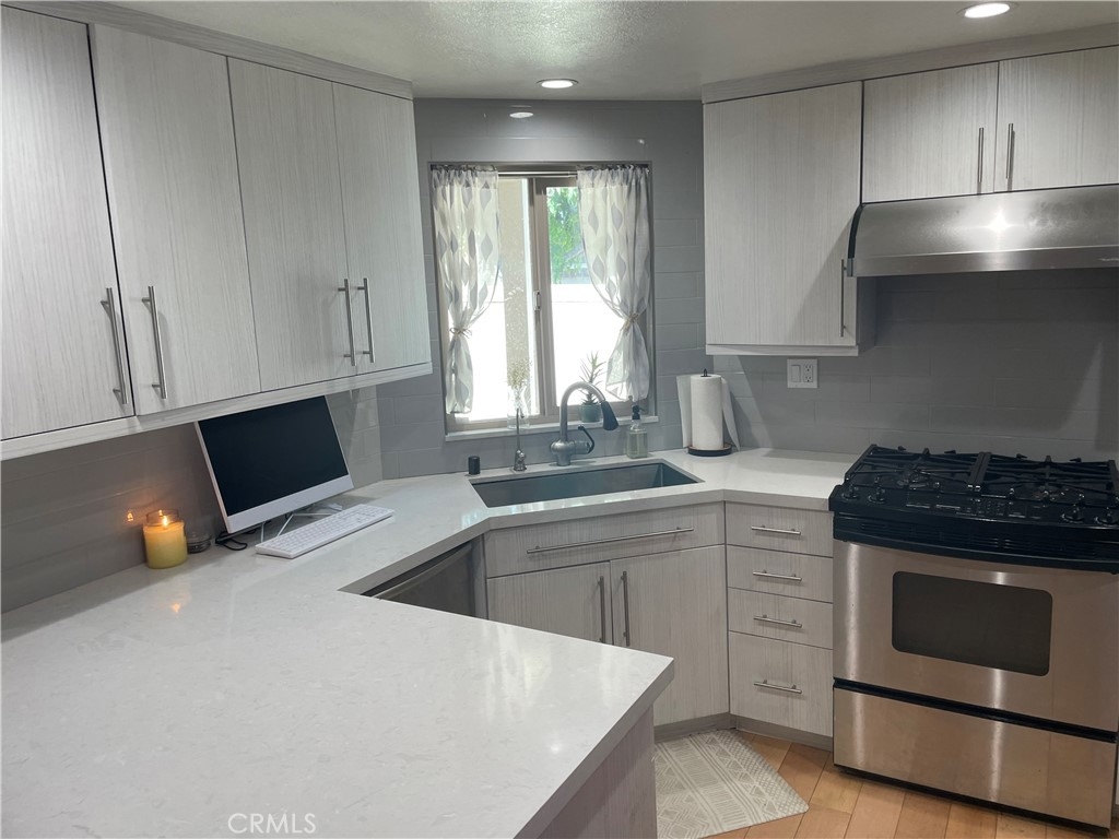 Price improvement ~ Feels like a single family home ~ This end unit single story townhouse is nestled in the coveted "Laurelwood" community with nobody above or below that checks off all the box's ~ One level with total privacy / remodeled kitchen & baths / attached garage / interior laundry room / spacious fenced yard ~ The unit is tucked away at a dead end cul-de-sac offering unique privacy and just steps to community pool-spa ~ Low $239 HOA dues ~ One car garage with dedicated parking space attached ~ Light & bright open floor plan with volume ceiling in living room overlooking fenced yard ~ Beautiful remodeled white kitchen open to living & dining which features soft close cabinets / drawers / quartz counters / cozy eating bar / tiled backsplash / stainless appliances / refrigerator included / recessed lighting ~ Inside laundry room with washer & dryer included ~ Primary bedroom features walk-in closet & remodeled bathroom with walk/in shower ~ Secondary bedroom has adjacent remodeled bath with deep soaking tub/shower ~ Contemporary raised panel doors/hardware-plantation shutters ~ Spacious patio with alumawood patio cover ~ Central Corona location close to shopping-parks-schools-freeways