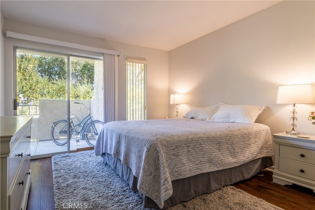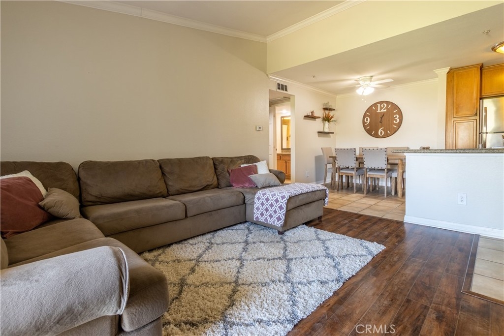 Rarely available 1 bed 1 bath top floor condominium in the highly desirable gated community of Triana. Enjoy your morning or evening relaxing on your private balcony with a beautiful park view that is accessible from the living room and bedroom! There are upgrades throughout this home with an open living area, spacious bedroom, bathroom, and walk in closet. The kitchen has stainless steel appliances with an included fridge, granite counters, and maple cabinetry with glass doors. The bathroom has been upgraded with granite countertops and a tiled shower. The living area has plenty of natural light, crown molding throughout, A/C, and upgraded laundry closet with in-unit washer and dryer hookups (washer & dryer included). Your property also includes a covered parking space, and there is plentiful guest parking within the community. The HOA dues include outside maintenance of the buildings, insurance, water, trash, and sewer. Enjoy life in this gated community with resort-like amenities including a large pool, spa, barbeque, fitness center, and clubhouse near the 91/15 freeways, shopping, restaurants, and the metro.