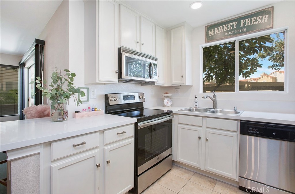 Corner unit delight! Step in and you’ll instantly feel welcomed by large windows in nearly every room— providing warm, and natural light. New paint adorns the living room, dining room, and kitchen, and new laminate flooring fills the home. New recessed lighting and beautiful quartz countertops frame this gorgeous kitchen, also filled with newer appliances throughout. Settled right next to the on-site volleyball courts, this 735 square foot property is ideal for enjoying all of the community’s amenities. Come see what this beautiful Sage Canyon condo has to offer. Located near the 241 Toll Road and 91 Express Lanes, this 1 bedroom, ground floor unit is perfectly nestled for convenient accessibility and travel.