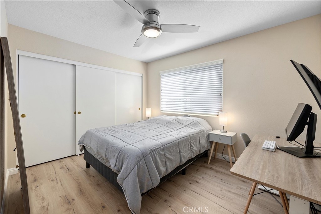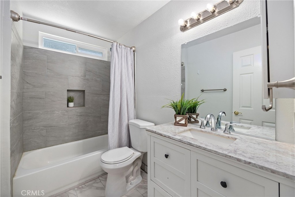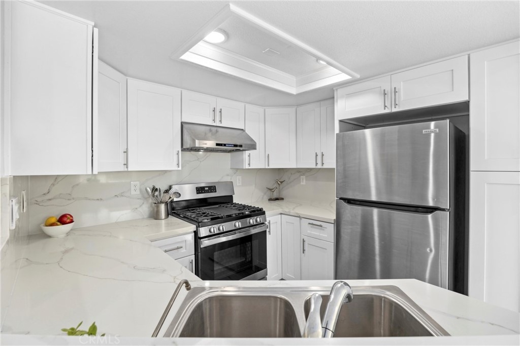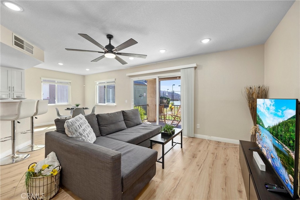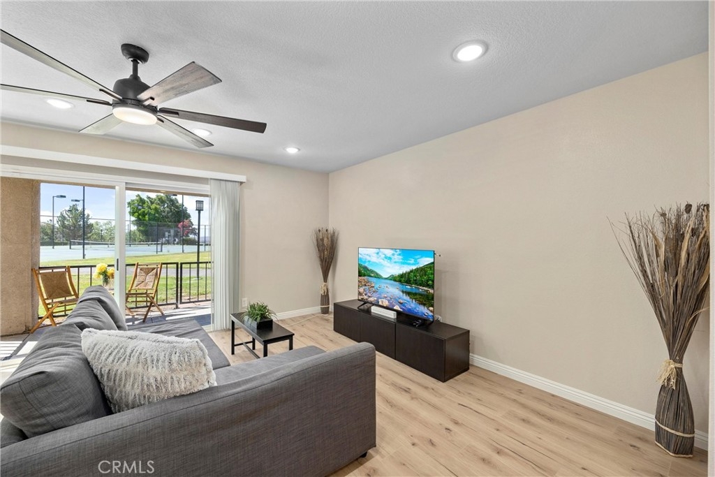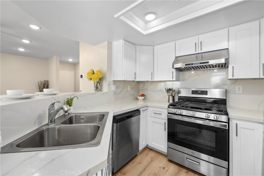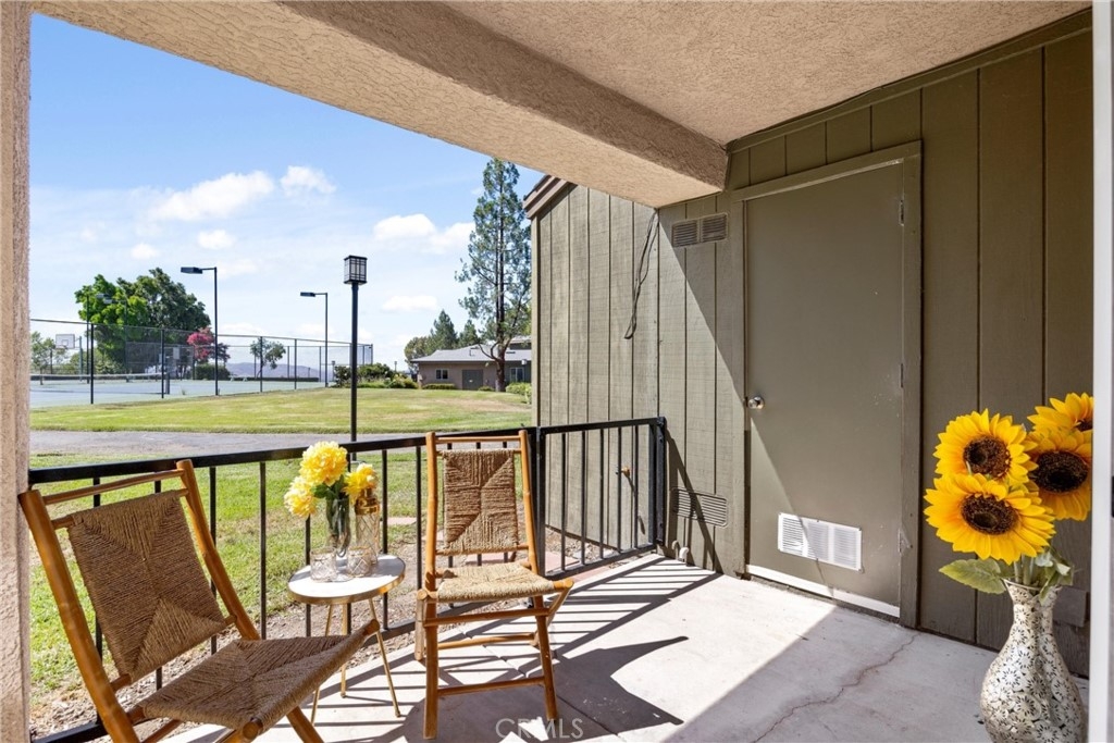 SELLER-PAID FIRST YEAR HOA FEES | FULLY REMODELED | 1ST FLOOR | 2 BEDROOMS + 2 ENSUITE BATHROOMS | CLOSE TO OC | GATED WITH TONS OF AMENITIES | This absolutely beautiful, fully remodeled 1-story condo is ready for the most discerning buyer. Natural light floods the open concept living space, which has been entirely upgraded for an easy, turnkey lifestyle. The heart of this home is the kitchen, featuring gorgeous quartz countertops, a full quartz backsplash, and ample breakfast bar seating. The white shaker-style cabinetry boasts slow-close drawers and cabinets, complemented by stunning stainless-steel appliances, including a refrigerator, stove, rangehood, and microwave. This culinary space opens to the spacious dining and living areas, illuminated by recessed lighting and corner windows plus a large slider leading to the patio, offering breathtaking views of the nearby Cleveland National Forest and the San Gabriel Mountain Range to the north. You'll find 2 spacious bedrooms, each with a fully remodeled en-suite bathroom and tons of closet space. The primary bedroom offers a private bathroom with quartz countertops and a bathtub/shower combination. The second bathroom features a sumptuous walk-in shower with a frameless glass door and custom tiling. Brand new luxury flooring flows throughout, seamlessly tying the entire residence together. LAUNDRY: Enjoy the convenience of a separate laundry room located on the spacious covered patio, with a stacking washer and dryer included. AMENITIES: This upscale condo community offers numerous amenities, including tennis courts, basketball court, beautiful pool and spa, well-equipped gym, dog park, clubhouse, and walking paths within its privately gated grounds. Trash and water are included. PARKING: 2 parking spots: a reserved, covered carport, and an additional uncovered space, plus ample visitor parking on-site. ENERGY EFFICIENCY: Energy efficiency is a priority, with new dual-pane windows, a large dual-pane sliding patio door, high-efficiency stainless steel appliances, new LED recessed lighting, central AC/heating, ceiling fans in the living room and bedrooms, and a smart NEST thermostat. LOCATION: Quick access to highways 91, 71, 15, the 91 Expressway, and the 241 Toll Road, and close to groceries, shopping, restaurants, and the Skyline Hiking Trail. WELCOME HOME: This property is truly move-in ready, offering a luxurious, low-maintenance lifestyle in the highly desired neighborhood of south-Corona.