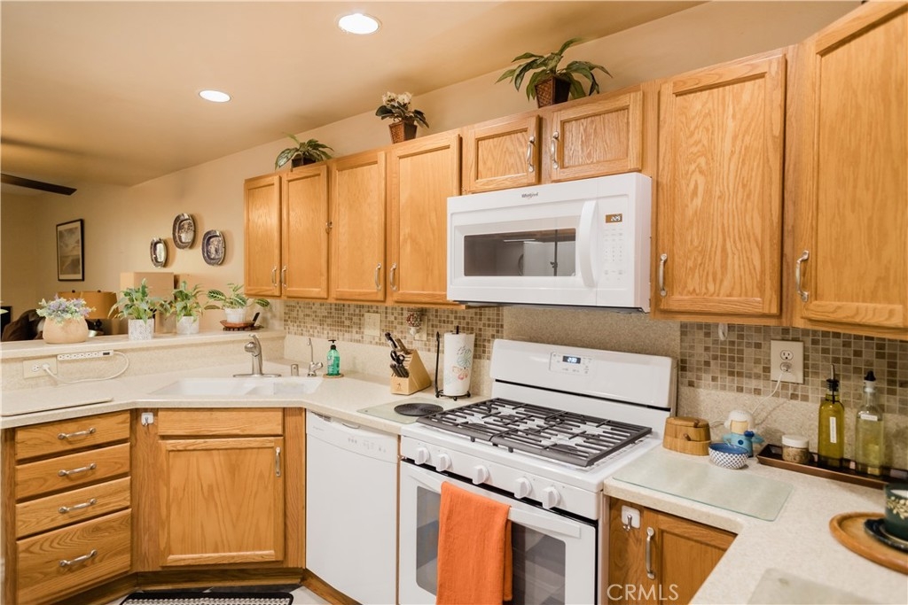 Price Reduced by $50,000. AMAZING condo, in a superb location on the quiet side of the community. This highly desirable all one-story ground level home offers 2 bedrooms 2 baths with an Attached Direct Entry Garage and Patio that Wraps around from the Living room to Master suite. This home is Upgraded, Turnkey, and ready for you!!! You will not find another one with all the positive attributes this has. Appears to be VA /FHA financeable with 2 recent VA closings in the community. All hard surface flooring throughout the home (no carpet) Tile and Luxury Vinyl Planking. Tall ceilings. The kitchen and family room have a great room layout with a breakfast bar, and dinette area. Kitchen has upgraded Corian countertops, full tile backsplash, and a brand new stove/oven & microwave. Family room is light and bright with a sliding glass door to the patio. The gas or wood fireplace has been upgraded with a tile surround. Both bedrooms are spacious and have more than ample closet space. Master bath offers a step-in shower and dual sinks. Both bathrooms have upgraded countertops and new faucets. Fire sprinkler system will save you money on your insurance. Recessed can lights and LED lighting throughout the home. Interior laundry room set up for side by side and shelves. 1 Car attached garage offers direct entry to the home, upgraded roll up door with opener & exterior keypad, and built-in storage cabinets & above. Water softener with no contract. Located away from the freeway, this home and patio stays super quiet. Located in a quiet family neighborhood. The association offers walking paths, pool, spa, BBQ area, and so much more. Located Close to the best food, shopping, and parks. This is the place to be.