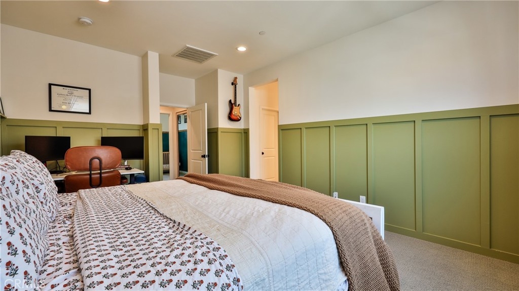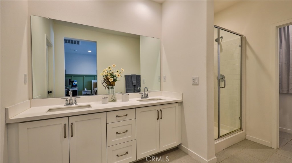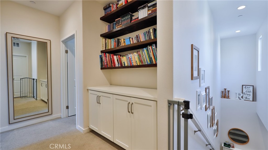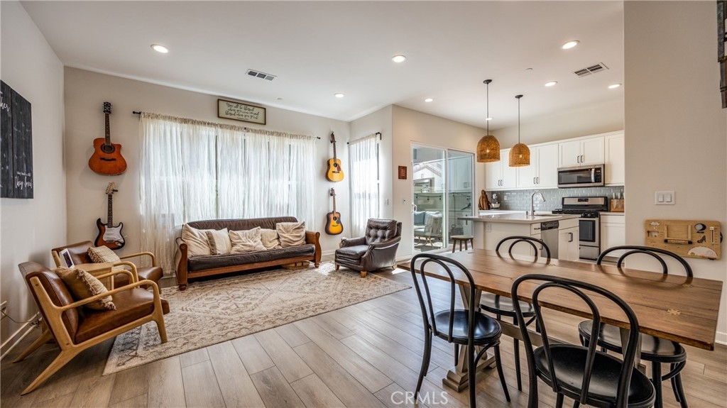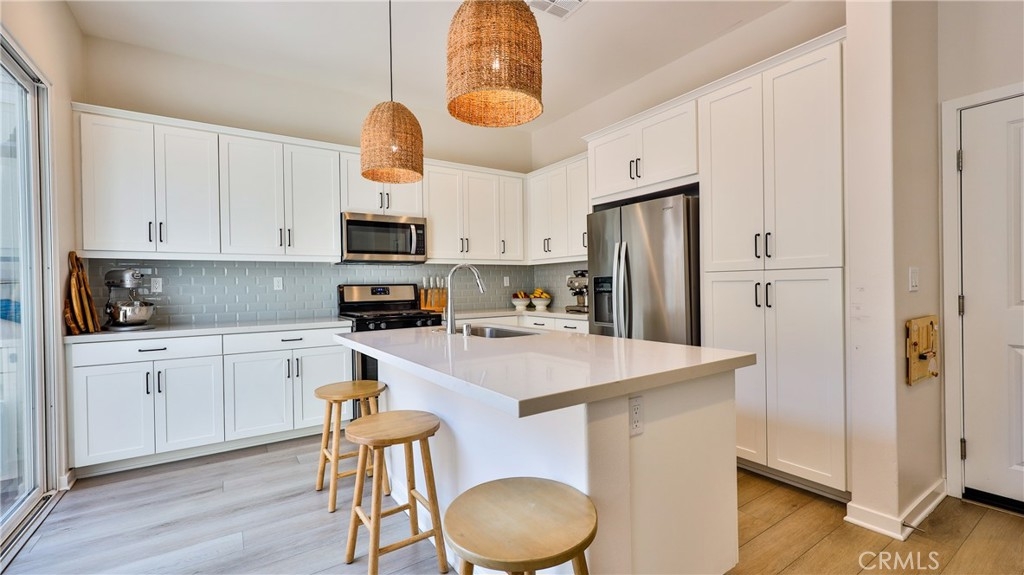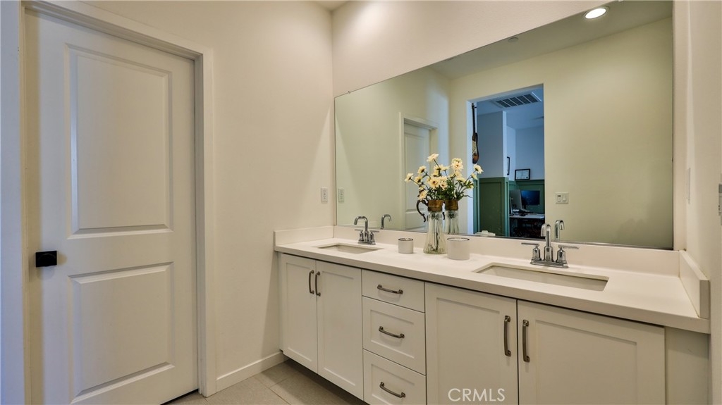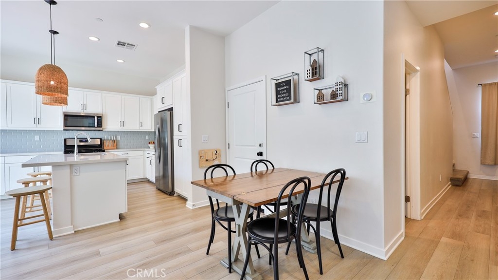 Beautifully Upgraded Home in the Sought-After City of Corona! This turn-key property offers 1,626 sq ft of stylish living space, featuring 3 bedrooms, 2.5 bathrooms, and a 2-car attached garage. Step inside to an open floor plan with high ceilings, recessed lighting, dual-pane windows, laminate flooring, and plush carpeting throughout. The modern kitchen boasts white cabinetry, quartz countertops, glass tile backsplash, stainless steel appliances, pantry, and direct access to the backyard—perfect for indoor-outdoor entertaining. The spacious primary suite showcases elegant wainscoting, recessed lighting, and an upgraded en-suite bathroom with dual vanities, a walk-in shower, and walk-in closet. Bedrooms 2 and 3 include ceiling fans and share a well-appointed full bath. Additional features include a convenient indoor laundry room with cabinets and shelving. The low-maintenance backyard is finished with pavers, artificial grass, and vinyl fencing—ideal for relaxing or entertaining. Enjoy resort-style amenities in the Bedford community, including parks, walking and hiking trails, a clubhouse, and a sparkling community pool and spa. Conveniently located near shopping, dining, and entertainment. Move-in ready—don’t miss this one!