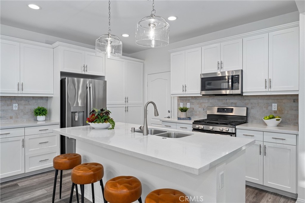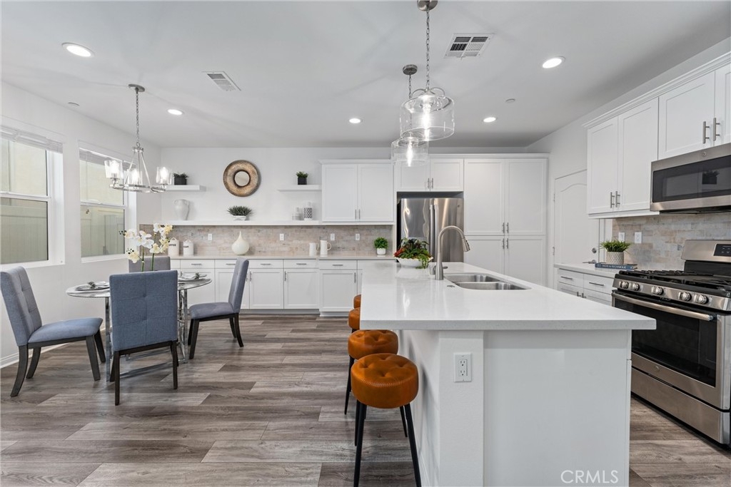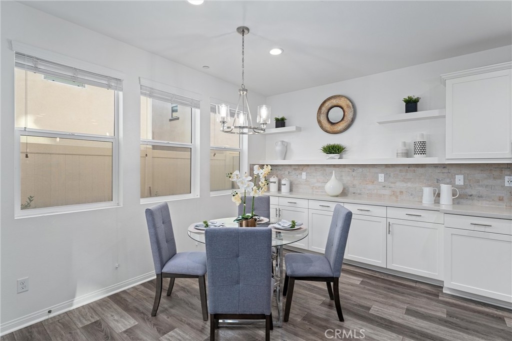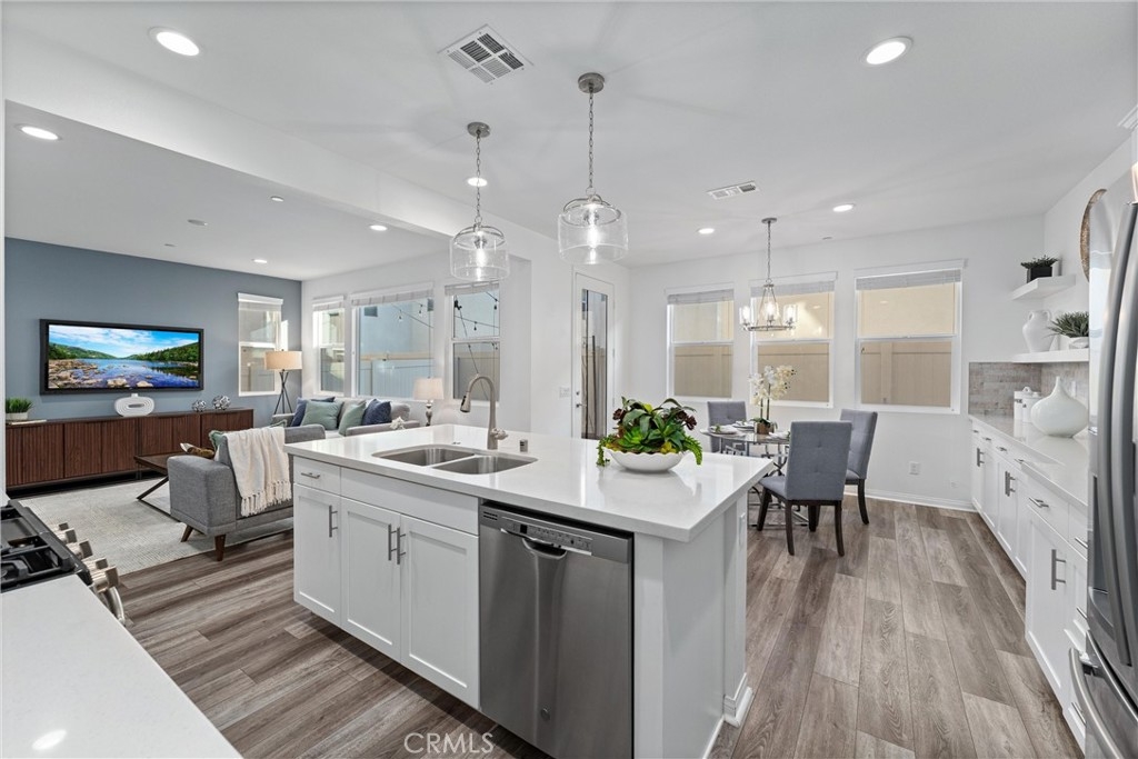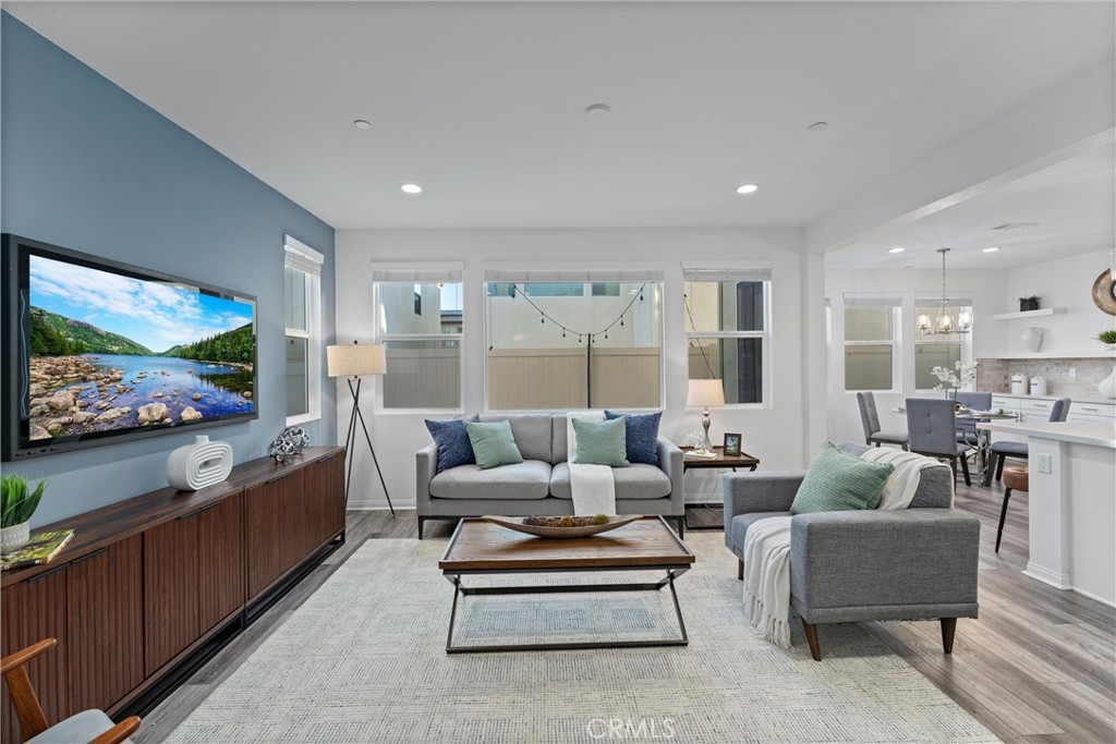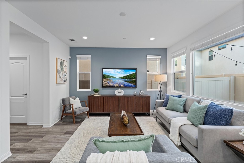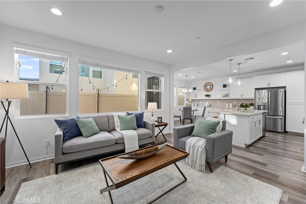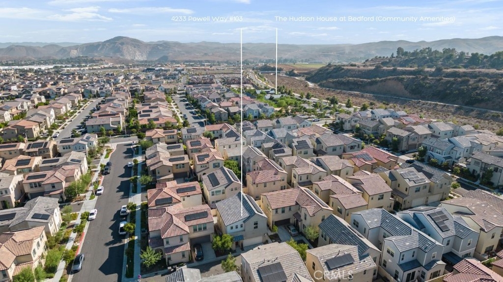 Indulge in luxury living at 4233 Powell Way #103, a stunning contemporary farmhouse style home nestled within the new gated community of Bedford. Built only a few years ago, this fully detached turnkey home offers 3 bedrooms plus an upstairs Loft / Flex Space, and 2.5 bathrooms, all spread across 1,791 square feet. Through a formal Foyer and past a beautiful staircase lies the Great Room - which is truly the heart of the home. A large Family Room, Dining Space, open concept Kitchen, and access to the backyard create the perfect space to entertain. The chef's Kitchen is light and bright with crisp white cabinets, a central island with bar seating, stainless steel appliances, and upgrades that include quartz countertops, stacked stone backsplash, designer pendants to illuminate the space, and a cabinet and counter extension upgrade with open shelving for extra storage, prep and display space. Upgraded LVP flooring that exudes style and practicality can also be found throughout the main floor. A low maintenance backyard with paver patio, turf, and charming bistro lights creates the ideal space to relax outdoors. The main floor is complete with a powder room and direct access 2 car garage. Upstairs, a Loft / Flex space is the perfect spot for a family gathering room, office, or playroom. Two generously sized secondary bedrooms, a convenient upstairs Laundry Room, hall bathroom with dual vanities, and Primary Ensuite round out the upper level. The Primary Suite is a true oasis boasting a massive ensuite bathroom with dual vanities, walk-in shower, separate toilet room, and spacious walk-in closet - all adding to the luxurious and upgraded feel of the home. 4233 Powell Way #103 is located in the highly desirable new gated community of Bedford, where residents have access to enviable amenities including multiple pools and spas at the Hudson House, and the soon to be completed Shed. Hudson House includes a quiet pool, resort pool, children's pool, spas, BBQs, lawn games, and playground. The Shed will include pools including a saltwater pool, event lawn for movies, gym, dog wash, more dining spaces, and a yoga lawn - all for only $231/month HOA dues! The neighborhood is adjacent to a brand new shopping center with a new Starbucks and other shopping and dining options in addition to being a short drive from shopping, dining, and entertainment at Crossings at Corona and the Shops at Dos Lagos. This home will not last long! Call to schedule a tour today!