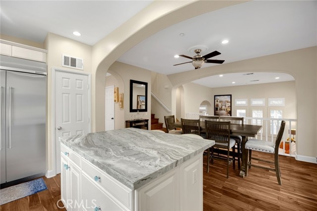 Beautiful Bright and airy sought after End unit, Impressive Entry with High Ceilings and arched openings lead your eyes to the to the upper level Kitchen and Dinning area, Kitchen Boasts Beautiful Marble Counters and a large Window to bring in natural light, large Primary bedroom with walk in closet and spacious primary Bathroom Primary Bath tub located in the center of the bathroom with a waterfall chandelier very impressive also includes a separate vanity with large mirror and plenty of lights, Stunning Hardwood floors and Marble Counter tops, beautiful white Shutters and a Two Car Garage on the Lower level With Extra Storage and like new Epoxy Floors Definitely Move in Ready Unit 106