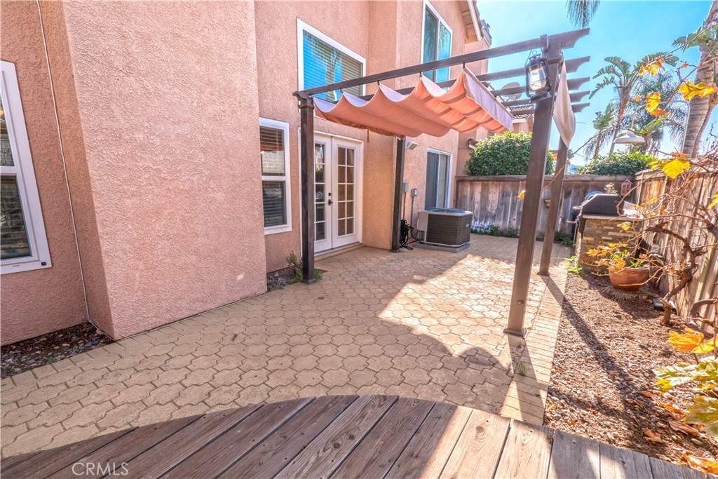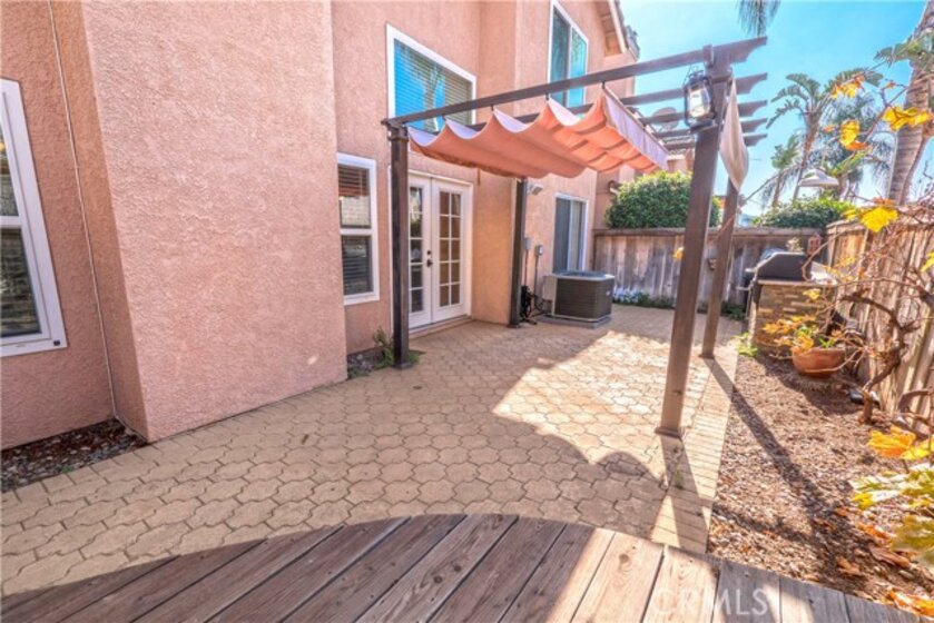 This absolutely beautiful home has everything it's new owners have been looking for. A great location, upgrades galore and over 1,300 square feet of comfortable and cozy living space. This end unit boasts numerous amenities including a tastefully remodeled kitchen with breakfast bar, granite counters, tile backsplash, laminate flooring and stainless steel appliances. The first level has a guest bathroom, an open and inviting living room with high cathedral ceilings, a remodeled stack stone fireplace and dual French doors leading to your very own backyard retreat with built-in BBQ Island perfect for hosting friends and family. The spacious upstairs master bedroom features it's own private bathroom with dual sinks, mirrored closets and plenty of natural light. Bedrooms two and three are good-sized and share another full bathroom complete with a deep vanity sink and a tub and shower. It also has energy efficient dual-pane windows and direct access to your 2-car garage. The First Impressions Community is the pride of the Corona Hills and is within walking distance to major retail and restaurants including Walmart, Applebees', Red Robin, UFC Gym, Home Depot and is just minutes to the 91 and 15 freeways.
