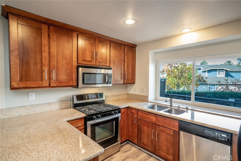Upgraded Gallery Townhome in immaculate condition. This home features 2 bedroom, 2 1/2 baths, 1110 square feet, built in 1984. New wood plank style, waterproof flooring, new carpet, new paint. Upgraded kitchen with shaker cabinets, granite counter tops and stainless steel appliances, (including refrigerator). Newer windows, Upgraded French doors with side windows, and a remodeled downstairs bathroom. Master bedroom has a super sized walk in closet with organizer. Attached two car garage has a washer and dryer (included). Other improvements include, smart thermostat, and light fixtures, newer central a/c unit, newer water heater, ceilings updated, crown moldings, ceiling fans, plantation shutters and more. Garage has addition cabinets and shelving. Private patio perfect for bbq and dining. Located near the community pool and spa. Walking distance to Centennial High School. No unit directly behind home adds to the desirability, as well as the beautiful view of the mountains.